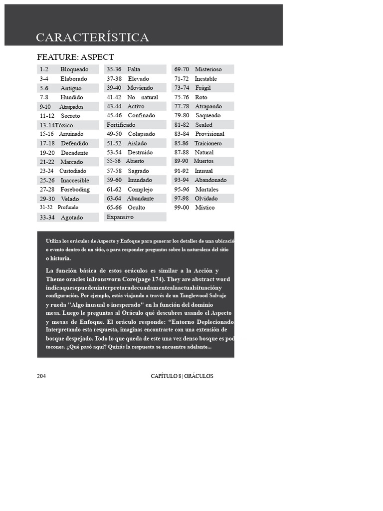 Oráculos detallados para ayudar a desarrollar el tema y la naturaleza de ese lugar.