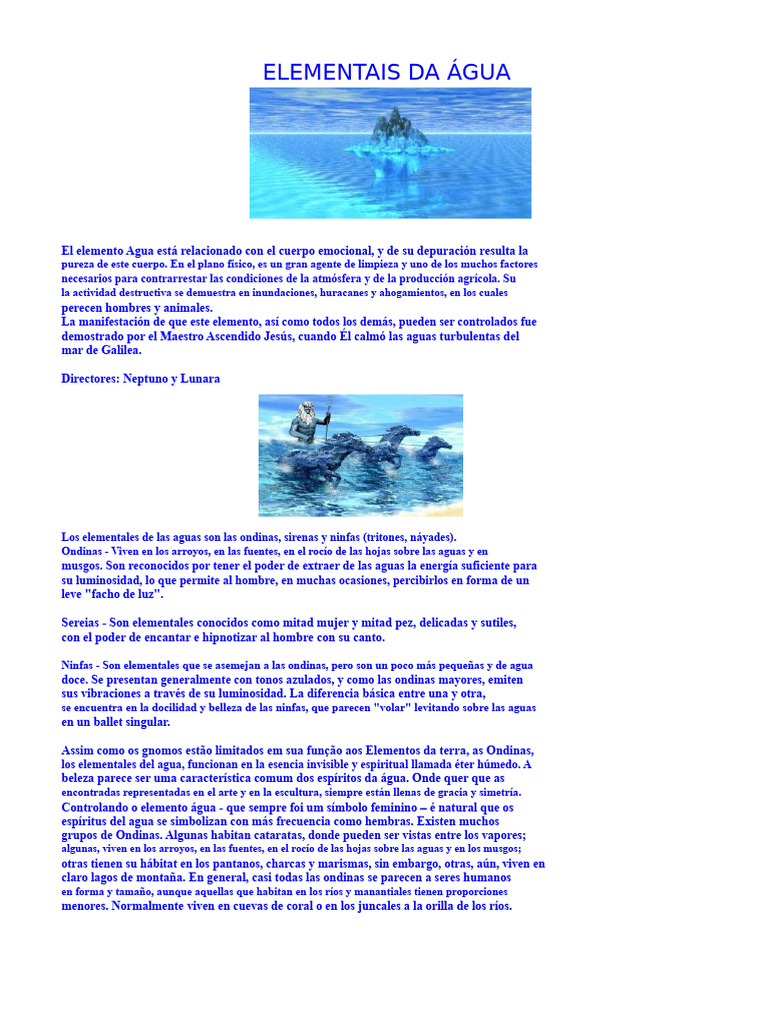 Los elementales de las aguas son las ondinas, sirenas y ninfas (tritones, náyades).