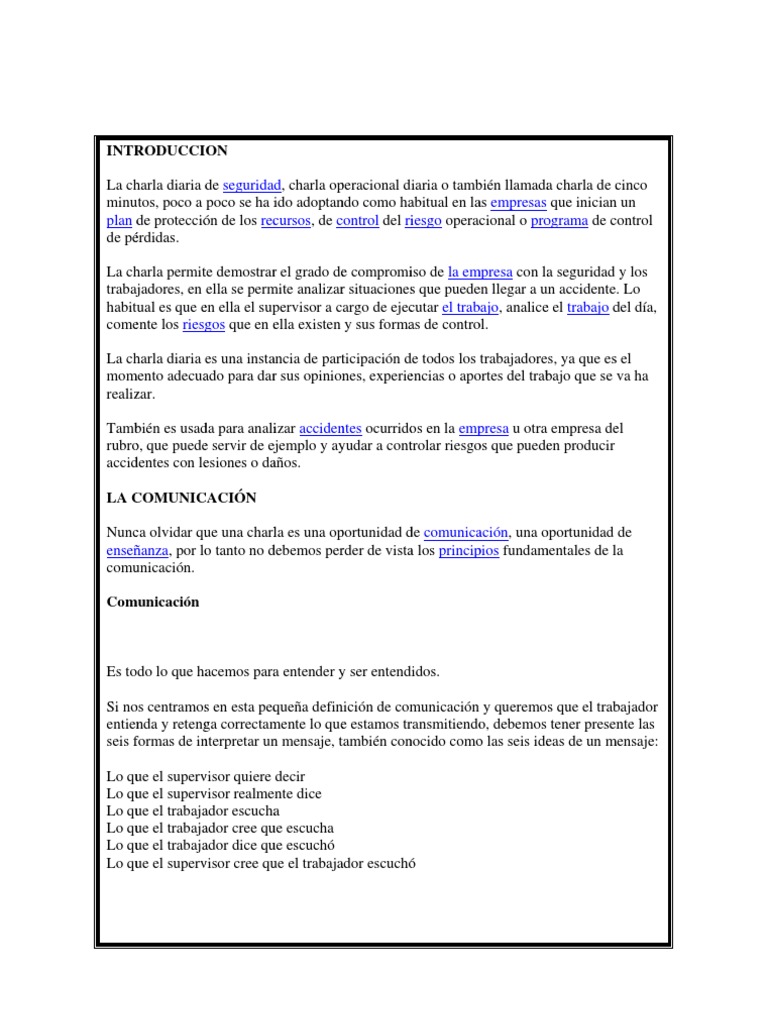 poco a poco se ha i adoptan como ha ido ndo abitual en la empresas que inician un as n plan d protecci de los rec de n cursos, de c control del ri iesgo operacional o pro ograma de c control de p rdidas. La ch harla permit demostrar el grado de compromi de la em te r e iso mpresa con la seguridad y los a trabaj jadores, en ella se perm analizar situaciones que puede llegar a u accidente. Lo mite r s en un habitu es que e ella el sup ual en pervisor a cargo de ejec cutar el trab bajo, analice el trabajo d da, e del come los riesg que en e existen y sus forma de contro ente gos ella as ol. La ch harla diaria es una insta ancia de part ticipacin d todos los trabajadores, ya que es el de s mom mento adecua para dar sus opinion experie ado r nes, encias o apo ortes del trab que se va ha bajo realiz zar. Tamb es usad para anali acciden ocurrido en la emp bin da izar ntes os presa u otra empresa de el rubro que puede servir de ej o, e ejemplo y ay yudar a cont trolar riesgo que puede producir os en accid dentes con le esiones o da aos. LA C COMUNIC CACIN Nunc olvidar qu una charl es una op ca ue la portunidad d comunica de acin, una o oportunidad de ense anza, por lo tanto no d o debemos per rder de vista los princip fundam a pios mentales de la comu unicacin. Com municacin