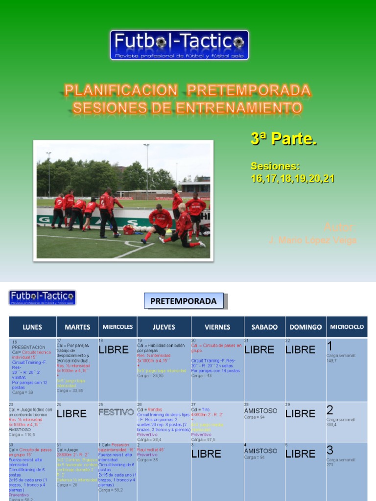 16 Cal. Circuito de pases en grupo. (10) Circuito de aceleracin carga media. 4 postas de 15m y mx 4 cambios de direccin de 45 en cada uno. Mx 10 saltos bajos o 4 medios en cada uno. Carga = 36,5 23 Partidillo. No ms de 60. Dividido en 2 tiempos como mnimo. Preventivo Carga = 67