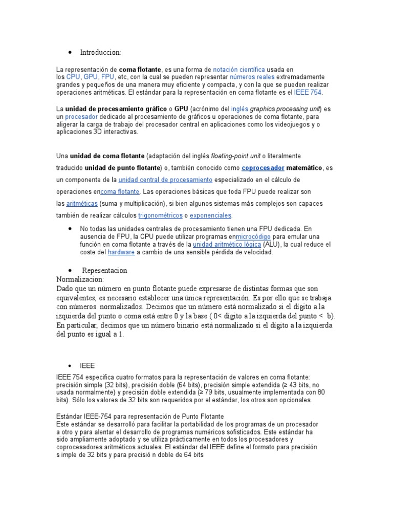 La representacin de coma flotante, es una forma de notacin cientfica usada en los CPU, GPU, FPU, etc, con la cual se pueden representar nmeros reales extremadamente grandes y pequeos de una manera muy eficiente y compacta, y con la que se pueden realizar operaciones aritmticas. El estndar para la representacin en coma flotante es el IEEE 754. La unidad de procesamiento grfico o GPU (acrnimo del ingls graphics processing unit) es un procesador dedicado al procesamiento de grficos u operaciones de coma flotante, para aligerar la carga de trabajo del procesador central en aplicaciones como los videojuegos y o aplicaciones 3D interactivas.