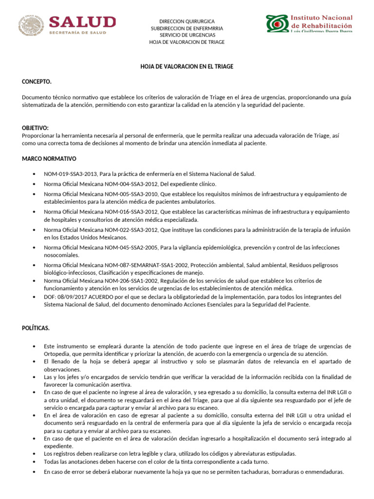 INSTRUCTIVO DE LLENADO DE LA HOJA DE VALORACION DE TRIAGE.