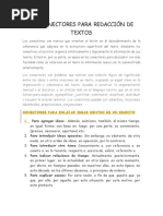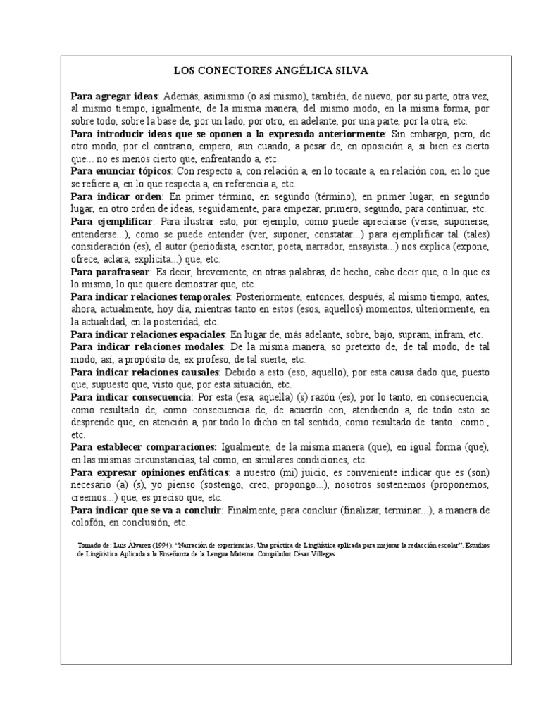 vez, al mismo tiempo, igualmente, de la misma manera, del mismo modo, en la misma forma, por sobre todo, sobre la base de, por un lado, por otro, en adelante, por una parte, por la otra, etc. Para introducir ideas que se oponen a la expresada anteriormente: Sin embargo, pero, de otro modo, por el contrario, empero, aun cuando, a pesar de, en oposicin a, si bien es cierto que... no es menos cierto que, enfrentando a, etc. Para enunciar tpicos: Con respecto a, con relacin a, en lo tocante a, en relacin con, en lo que se refiere a, en lo que respecta a, en referencia a, etc. Para indicar orden: En primer trmino, en segundo (trmino), en primer lugar, en segundo lugar, en otro orden de ideas, seguidamente, para empezar, primero, segundo, para continuar, etc. Para ejemplificar: Para ilustrar esto, por ejemplo, como puede apreciarse (verse, suponerse, entenderse...), como se puede entender (ver, suponer, constatar...) para ejemplificar tal (tales) consideracin (es), el autor (periodista, escritor, poeta, narrador, ensayista...) nos explica (expone, ofrece, aclara, explicita...) que, etc. Para parafrasear: Es decir, brevemente, en otras palabras, de hecho, cabe decir que, o lo que es lo mismo, lo que quiere demostrar que, etc. Para indicar relaciones temporales: Posteriormente, entonces, despus, al mismo tiempo, antes, ahora, actualmente, hoy da, mientras tanto en estos (esos, aquellos) momentos, ulteriormente, en la actualidad, en la posteridad, etc. Para indicar relaciones espaciales: En lugar de, ms adelante, sobre, bajo, supram, infram, etc. Para indicar relaciones modales: De la misma manera, so pretexto de, de tal modo, de tal modo, as, a propsito de, ex profeso, de tal suerte, etc. Para indicar relaciones causales: Debido a esto (eso, aquello), por esta causa dado que, puesto que, supuesto que, visto que, por esta situacin, etc. Para indicar consecuencia: Por esta (esa, aquella) (s) razn (es), por lo tanto, en consecuencia, como resultado de, como consecuencia de, de acuerdo con, atendiendo a, de todo esto se desprende que, en atencin a, por todo lo dicho en tal sentido, como resultado de tanto...como., etc. Para establecer comparaciones: Igualmente, de la misma manera (que), en igual forma (que), en las mismas circunstancias, tal como, en similares condiciones, etc. Para expresar opiniones enfticas: a nuestro (mi) juicio, es conveniente indicar que es (son) necesario (a) (s), yo pienso (sostengo, creo, propongo...), nosotros sostenemos (proponemos, creemos...) que, es preciso que, etc. Para indicar que se va a concluir: Finalmente, para concluir (finalizar, terminar...), a manera de colofn, en conclusin, etc.
