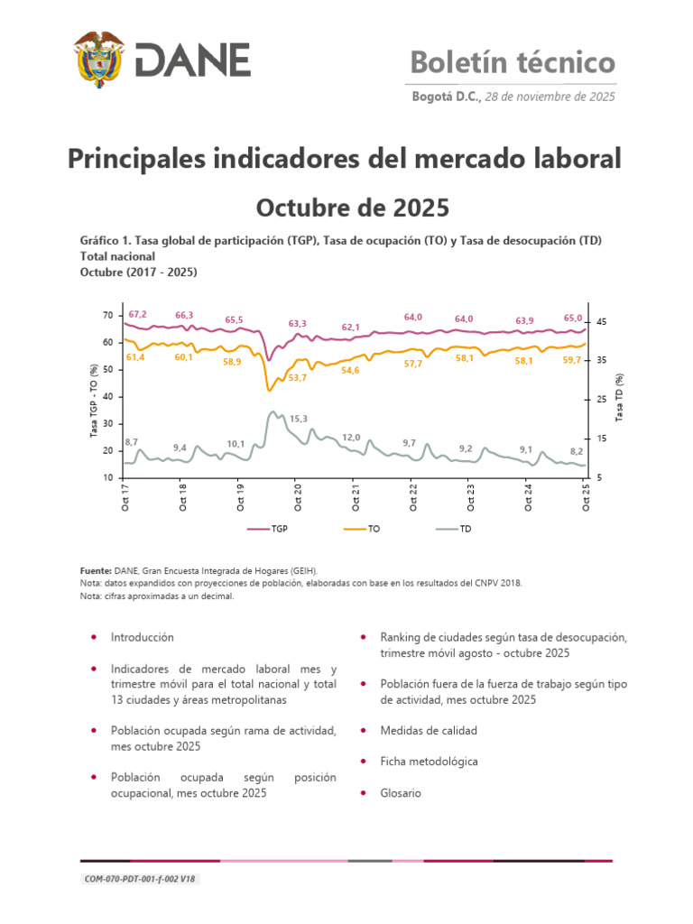 colombiano, como son la Tasa Global de Participación (TGP), la Tasa de Ocupación (TO) y la Tasa de