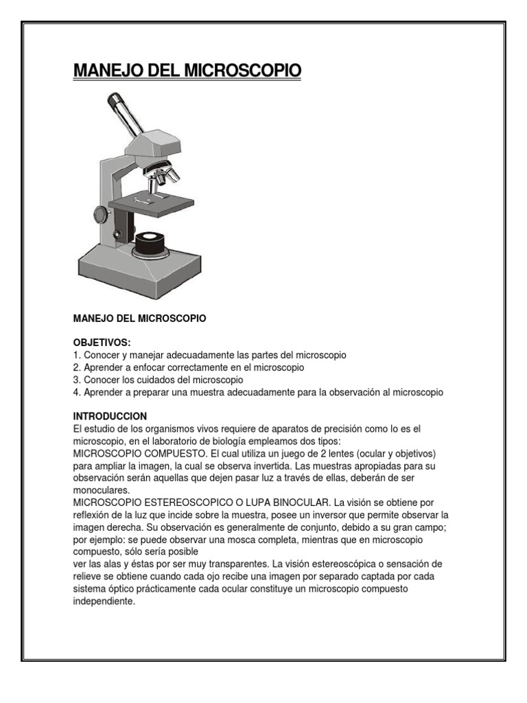 MANEJO DEL MICROSCOPIO OBJETIVOS: 1. Conocer y manejar adecuadamente las partes del microscopio 2. Aprender a enfocar correctamente en el microscopio 3. Conocer los cuidados del microscopio 4. Aprender a preparar una muestra adecuadamente para la observacin al microscopio INTRODUCCION El estudio de los organismos vivos requiere de aparatos de precisin como lo es el microscopio, en el laboratorio de biologa empleamos dos tipos: MICROSCOPIO COMPUESTO. El cual utiliza un juego de 2 lentes (ocular y objetivos) para ampliar la imagen, la cual se observa invertida. Las muestras apropiadas para su observacin sern aquellas que dejen pasar luz a travs de ellas, debern de ser monoculares. MICROSCOPIO ESTEREOSCOPICO O LUPA BINOCULAR. La visin se obtiene por reflexin de la luz que incide sobre la muestra, posee un inversor que permite observar la imagen derecha. Su observacin es generalmente de conjunto, debido a su gran campo; por ejemplo: se puede observar una mosca completa, mientras que en microscopio compuesto, slo sera posible ver las alas y stas por ser muy transparentes. La visin estereoscpica o sensacin de relieve se obtiene cuando cada ojo recibe una imagen por separado captada por cada sistema ptico prcticamente cada ocular constituye un microscopio compuesto independiente.