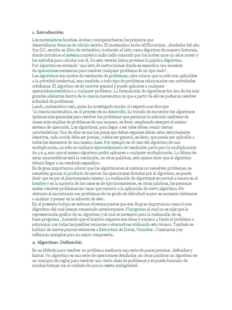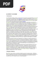El matemtico rabe Al'Khwarizmi , alrededor del ao 830 DC, escribe un libro de Aritmtica, traducido al latn como Algoritmi de numero Indorum, donde introduce el sistema numrico indio (slo conocido por los rabes unos 50 aos antes) y los mtodos para calcular con l. De esta versin latina proviene la palabra Algoritmo. Por algoritmo se entiende "una lista de instrucciones donde se especifica una sucesin de operaciones necesarias para resolver cualquier problema de un tipo dado". Los algoritmos son modos de resolucin de problemas, cabe aclarar que no slo son aplicables a la actividad intelectual, sino tambin a todo tipo de problemas relacionados con actividades cotidianas. El algoritmo es de carcter general y puede aplicarse a cualquier operacinmatemtica o a cualquier problema. La formulacin de algoritmos fue uno de los ms grandes adelantos dentro de la ciencia matemtica ya que a partir de ello se pudieron resolver infinidad de problemas. Landa, matemtico ruso, quien ha investigado mucho al respecto nos dice que "la ciencia matemtica, en el proceso de su desarrollo, ha tratado de encontrar los algoritmos ptimos ms generales para resolver los problemas que permitan la solucin uniforme de clases ms amplias de problemas de una manera, es decir, empleando siempre el mismo sistema de operacin. Los algoritmos, para llegar a ser tales deben reunir ciertas caractersticas. Una de ellas es que los pasos que deben seguirse deben estar estrictamente descritos, cada accin debe ser precisa, y debe ser general, es decir, que pueda ser aplicable a todos los elementos de una misma clase. Por ejemplo en el caso del algoritmo de una multiplicacin, no slo se realizar elprocedimiento de resolucin parte para la multiplicacin de 4 x 4, sino que el mismo algoritmo podr aplicarse a cualquier multiplicacin. La ltima de estas caractersticas ser la resolucin, en otras palabras, esto quiere decir que el algoritmo deber llegar a un resultado especfico. Es de gran importancia aclarar que los algoritmos en si mismos no resuelven problemas, se resuelven gracias al producto de ejercer las operaciones dictadas por el algoritmo, se puede decir que es por el planteamiento mismo. La realizacin de algoritmos es natural e innata en el hombre y en la mayora de los casos es de tipo inconsciente, en otras palabras, las personas suelen resolver problemas sin tener que recurrir a la aplicacin de cierto algoritmo. No obstante al encontrarse con problemas de un grado de dificultad mayor es necesario detenerse a analizar y pensar en la solucin de ste . En el presente trabajo se enfocan diversos puntos que son de gran importancia como lo son Algoritmo del cual hemos comentado anteriormente .Flujograma el cual no es ms que la representacin grfica de un algoritmo y el cual es necesario para la realizacin de un buen programa , haciendo que el hombre organice sus ideas y conozca a fondo el problema a solucionar con todas las posibles variantes o alternativas utilizando esta tcnica. Tambin se hablar de ciertos puntos referentes a Estructura de Datos, Variables , Constantes y se reflejaran ejemplos para su mejor compresin. 2. Algoritmo: Definicin Es un Mtodo para resolver un problema mediante una serie de pasos precisos , definidos y finitos. Un algoritmo es una serie de operaciones detalladas ,en otras palabras un algoritmo es un conjunto de reglas para resolver una cierta clase de problemas y se puede formular de muchas formas con el cuidado de que no exista ambigedad.