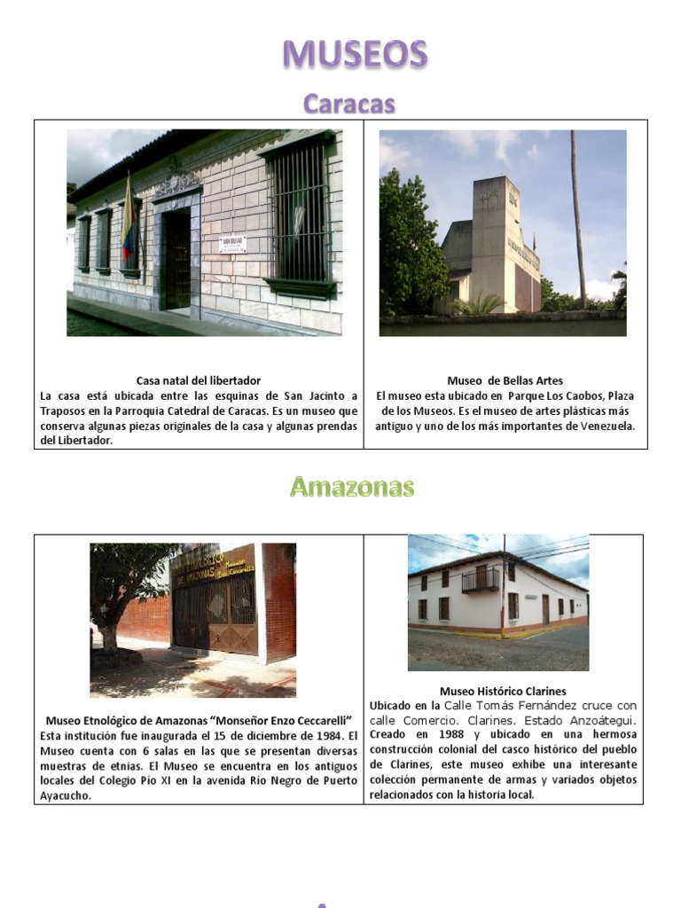 Museo Histrico Clarines Ubicado en la Calle Toms Fernndez cruce con Museo Etnolgico de Amazonas Monseor Enzo Ceccarelli Esta institucin fue inaugurada el 15 de diciembre de 1984. El Museo cuenta con 6 salas en las que se presentan diversas muestras de etnias. El Museo se encuentra en los antiguos locales del Colegio Po XI en la avenida Ro Negro de Puerto Ayacucho.