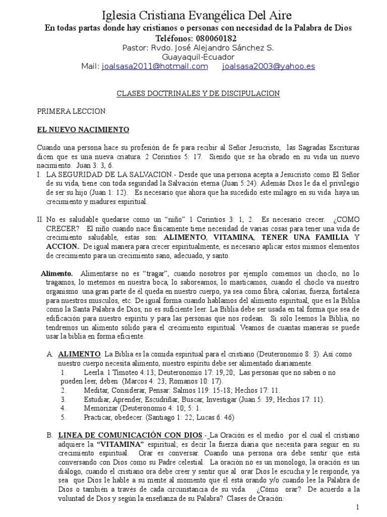 Pastor: Rvdo. Jos Alejandro Snchez S. Guayaquil-Ecuador Mail: joalsasa2011@hotmail.com joalsasa2003@yahoo.es CLASES DOCTRINALES Y DE DISCIPULACION PRIMERA LECCION: EL NUEVO NACIMIENTO Cuando una persona hace su profesin de fe para recibir al Seor Jesucristo, las Sagradas Escrituras dicen que es una nueva criatura. 2 Corintios 5: 17. Siendo que se ha obrado en su vida un nuevo nacimiento. Juan 3: 3, 6. I. LA SEGURIDAD DE LA SALVACION.- Desde que una persona acepta a Jesucristo como El Seor de su vida, tiene con toda seguridad la Salvacin eterna (Juan 5:24). Adems Dios le da el privilegio de ser su hijo (Juan 1: 12). Es necesario que ahora que ha sucedido este milagro en su vida haya un crecimiento y madures espiritual. II. No es saludable quedarse como un nio 1 Corintios 3: 1, 2. Es necesario crecer. COMO CRECER? El nio cuando nace fsicamente tiene necesidad de varias cosas para tener una vida de crecimiento saludable, estas son: ALIMENTO, VITAMINA, TENER UNA FAMILIA Y ACCION.. De igual manera para crecer espiritualmente, es necesario aplicar estos mismos elementos de crecimiento para un crecimiento sano, adecuado, y santo. Alimento. Alimentarse no es tragar, cuando nosotros por ejemplo comemos un choclo, no lo tragamos, lo metemos en nuestra boca, lo saboreamos, lo masticamos, cuando el choclo va nuestro organismo una gran parte de l queda en nuestro cuerpo, ya sea como fibra, caloras, fuerza, fortaleza para nuestros musculos, etc. De igual forma cuando hablamos del alimento espiritual, que es la Biblia como la Santa Palabra de Dios, no es suficiente leer. La Biblia debe ser usada en tal forma que sea de edificacin para nuestro espritu y para las personas que nos rodean. Si slo leemos la Biblia, no tendremos un alimento slido para el crecimiento espiritual. Veamos de cuantas maneras se puede usar la biblia en forma eficiente. A. ALIMENTO. La Biblia es la comida espiritual para el cristiano (Deuteronomio 8: 3). As como nuestro cuerpo necesita alimento, nuestro espritu debe ser alimentado diariamente. 1. Leerla. 1 Timoteo 4:13; Deuteronomio 17: 19,20; Las personas que no saben o no pueden leer, deben (Marcos 4: 23; Romanos 10: 17). 2. Meditar, Considerar, Pensar: Salmos 119: 15-18; Hechos 17: 11. 3. Estudiar, Aprender, Escudriar, Buscar, Investigar (Juan 5: 39; Hechos 17: 11). 4. Memorizar (Deuteronomio 4: 10; 5: 1. 5. Practicar, obedecer. (Santiago 1: 22; Lucas 6: 46) B. LINEA DE COMUNICACIN CON DIOS.- La Oracin es el medio por el cual el cristiano adquiere la VITAMINA espiritual; es decir la fuerza diaria que necesita para seguir en su crecimiento espiritual. Orar es conversar. Cuando una persona ora debe sentir que est conversando con Dios como su Padre celestial. La oracin no es un monologo, la oracin es un dilogo, cuando el cristiano ora debe creer y sentir que al orar Dios le escucha y le responde, ya sea que Dios le hable a su mente al momento que l est orando y/o cuando lee la Palabra de Dios o tambin a travs de cada circunstancia de su vida. Cmo orar? De acuerdo a la voluntad de Dios y segn la enseanza de su Palabra? Clases de Oracin: 1