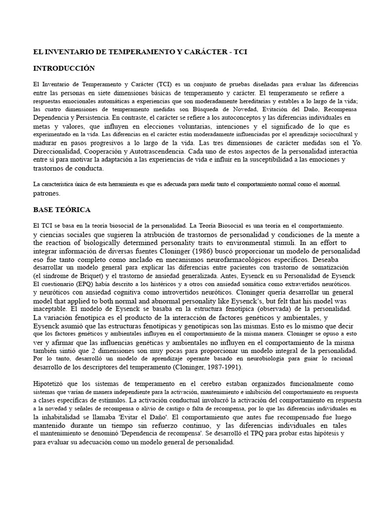 El Inventario de Temperamento y Carácter (TCI) es un conjunto de pruebas diseñadas para evaluar las diferencias