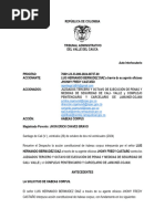 8 Artculo 454. Consagracin. El Hbeas corpus es un derecho que procede en amparo de la libertad personal contra todo acto arbitrario de cualquier autoridad que tienda a restringirla. Artculo 455. Procedencia. Cuando una persona sea capturada con violacin de las garantas constitucionales o legales, o se prolongue ilcitamente la privacin de la libertad, puede invocar el derecho de Hbeas corpus. La peticin se tramitar inmediatamente segn el procedimiento que a continuacin se establece. Artculo 456. Funcionarios competentes. El derecho de Hbeas corpus puede invocarse ante cualquier juez penal del lugar donde se encuentre el aprehendido, o ante el juez penal del municipio ms prximo cuando la captura ha sido ordenada por el nico juez penal que labora en el municipio. Artculo 457. Recusacin improcedente. En ningn caso podr ser recusado el funcionario que tramita el Hbeas corpus. Artculo 458. Personas facultadas para invocarlo. La peticin de Hbeas corpus podr ser presentada por el mismo capturado, por cualquier otra persona en su nombre sin necesidad de poder para tal efecto, o por el Ministerio Pblico. Artculo 459. Contenido de la peticin. La peticin de Hbeas corpus deber contener el nombre de la persona en cuyo favor se interviene, las razones por las cuales considera que con la privacin de su libertad se est violando la Constitucin o la ley, la fecha de reclusin y lugar donde se encuentre el capturado, y en lo posible el nombre del funcionario que ha ordenado la captura y el cargo que desempea. Adems bajo la gravedad del juramento que se considera prestado por la presentacin de la peticin, deber afirmarse que ningn otro juez penal ha asumido el conocimiento de la solicitud de Hbeas corpus o decidido sobre la misma. Artculo 460. Trmite. Recibida la solicitud, el funcionario decretar inmediatamente una inspeccin a las diligencias que pudieren existir en el asunto que dio lugar a la peticin, que deber practicarse a ms tardar dentro de las doce (12) horas siguientes. En ningn caso se someter a reparto la peticin y conocer de ella privativamente el funcionario ante quien se formule. Artculo 461. Informe sobre captura. Si la autoridad que hubiere decretado la captura no fuere del mismo lugar del juez que tramita la peticin de Hbeas corpus y ste no pudiere trasladarse a la sede de aquella, solicitar por el medio ms rpido, informacin completa sobre la situacin que dio origen a la peticin. A esta solicitud se dar respuesta inmediata, remitiendo copia de las diligencias adelantadas contra el capturado. Se podr solicitar del respectivo Director de la crcel una informacin urgente sobre todo lo concerniente a la captura. El juez podr interrogar directamente a la persona capturada. Artculo 462. Decisin. Demostrada la violacin de las garantas constitucionales o legales, el juez ordenar la libertad de la persona capturada a ms tardar dentro de las cuatro (4) horas siguientes, por auto interlocutorio contra el cual no procede recurso alguno. Artculo 463. Improcedencia de medidas restrictivas de la libertad. La persona capturada con violacin de las garantas consagradas en la Constitucin o en la ley, no podr ser afectada con medida restrictiva de su libertad mientras no se restauren las garantas quebrantadas. Por tanto, son inexistentes las medidas que tengan por finalidad impedir la libertad del capturado cuando ella se conceda a consecuencia del derecho de Hbeas corpus. Artculo 464. Improcedencia del Hbeas corpus. En los casos de prolongacin ilcita de privacin de libertad no proceder el Hbeas corpus cuando, con anterioridad a la peticin, se haya proferido auto de detencin o sentencia, sin perjuicio de la responsabilidad penal y disciplinaria del funcionario. Artculo 465. Das y horas hbiles. Recibida la peticin de Hbeas corpus, en das y horas de despacho judicial, la actuacin que corresponda no podr suspenderse o aplazarse por la interposicin de das festivos o de vacancia judicial. Artculo 466. Iniciacin del proceso penal. Reconocido el Hbeas corpus, el juez compulsar copias para que el funcionario competente inicie las investigaciones a que haya lugar. 9 Artculo 1. Cuando se invoque el derecho de hbeas corpus a favor de alguna persona vinculada por cualquiera de los delitos previstos en el Decreto 180 de 1988 y en la Ley 30 de 1986, se aplicarn las normas vigentes sobre la materia siempre que no sea contrarias a las disposiciones contenidas en el presente decreto. Artculo 2. Ser competente para conocer y decidir sobre el derecho de hbeas corpus, en los delitos descritos en el Decreto 180