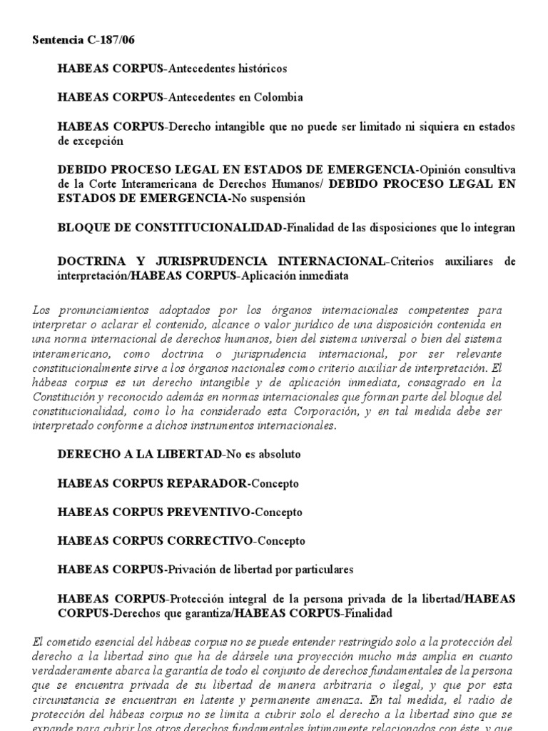 Análisis de la Sentencia C-187/06 sobre Hábeas Corpus