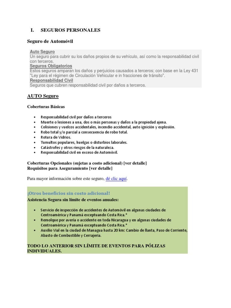 Auto Seguro Un seguro para cubrir su los daos propios de su vehculo, as como la responsabilidad civil con terceros. Seguros Obligatorios Estos seguros amparan los daos y perjuicios causados a terceros; con base en la Ley 431 "Ley para el rgimen de Circulacin Vehicular e in fracciones de trnsito". Responsabilidad Civil Seguros que cubren responsabilidad civil por daos a terceros.