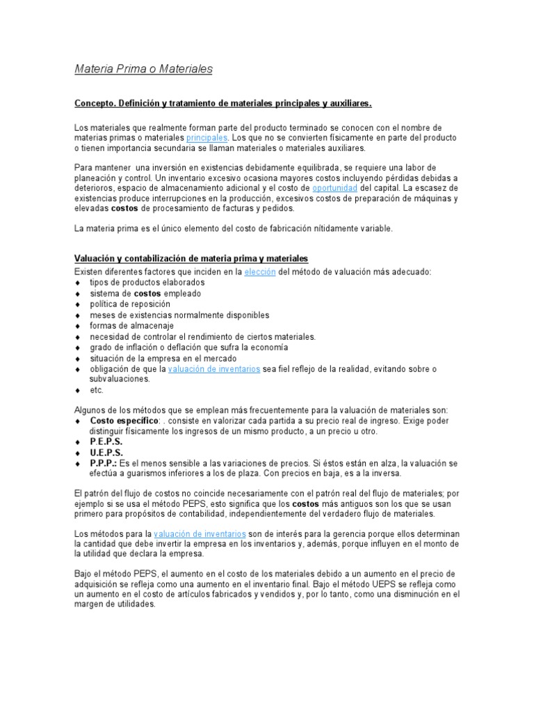 Concepto. Definicin y tratamiento de materiales principales y auxiliares. Los materiales que realmente forman parte del producto terminado se conocen con el nombre de materias primas o materiales principales. Los que no se convierten fsicamente en parte del producto o tienen importancia secundaria se llaman materiales o materiales auxiliares. Para mantener una inversin en existencias debidamente equilibrada, se requiere una labor de planeacin y control. Un inventario excesivo ocasiona mayores costos incluyendo prdidas debidas a deterioros, espacio de almacenamiento adicional y el costo de oportunidad del capital. La escasez de existencias produce interrupciones en la produccin, excesivos costos de preparacin de mquinas y elevadas costos de procesamiento de facturas y pedidos. La materia prima es el nico elemento del costo de fabricacin ntidamente variable. Valuacin y contabilizacin de materia prima y materiales Existen diferentes factores que inciden en la eleccin del mtodo de valuacin ms adecuado: tipos de productos elaborados sistema de costos empleado poltica de reposicin meses de existencias normalmente disponibles formas de almacenaje necesidad de controlar el rendimiento de ciertos materiales. grado de inflacin o deflacin que sufra la economa situacin de la empresa en el mercado obligacin de que la valuacin de inventarios sea fiel reflejo de la realidad, evitando sobre o subvaluaciones. etc. Algunos de los mtodos que se emplean ms frecuentemente para la valuacin de materiales son: Costo especfico: . consiste en valorizar cada partida a su precio real de ingreso. Exige poder distinguir fsicamente los ingresos de un mismo producto, a un precio u otro. P.E.P.S. U.E.P.S. P.P.P.: Es el menos sensible a las variaciones de precios. Si stos estn en alza, la valuacin se efecta a guarismos inferiores a los de plaza. Con precios en baja, es a la inversa. El patrn del flujo de costos no coincide necesariamente con el patrn real del flujo de materiales; por ejemplo si se usa el mtodo PEPS, esto significa que los costos ms antiguos son los que se usan primero para propsitos de contabilidad, independientemente del verdadero flujo de materiales. Los mtodos para la valuacin de inventarios son de inters para la gerencia porque ellos determinan la cantidad que debe invertir la empresa en los inventarios y, adems, porque influyen en el monto de la utilidad que declara la empresa. Bajo el mtodo PEPS, el aumento en el costo de los materiales debido a un aumento en el precio de adquisicin se refleja como una aumento en el inventario final. Bajo el mtodo UEPS se refleja como un aumento en el costo de artculos fabricados y vendidos y, por lo tanto, como una disminucin en el margen de utilidades.
