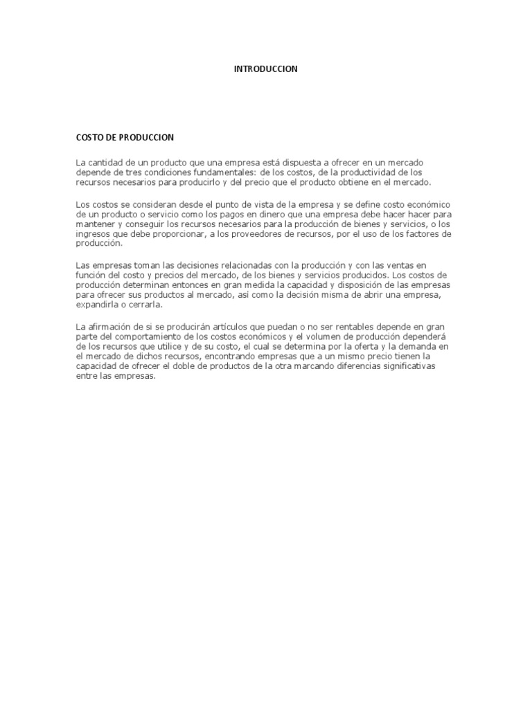 La cantidad de un producto que una empresa est dispuesta a ofrecer en un mercado depende de tres condiciones fundamentales: de los costos, de la productividad de los recursos necesarios para producirlo y del precio que el producto obtiene en el mercado. Los costos se consideran desde el punto de vista de la empresa y se define costo econmico de un producto o servicio como los pagos en dinero que una empresa debe hacer hacer para mantener y conseguir los recursos necesarios para la produccin de bienes y servicios, o los ingresos que debe proporcionar, a los proveedores de recursos, por el uso de los factores de produccin. Las empresas toman las decisiones relacionadas con la produccin y con las ventas en funcin del costo y precios del mercado, de los bienes y servicios producidos. Los costos de produccin determinan entonces en gran medida la capacidad y disposicin de las empresas para ofrecer sus productos al mercado, as como la decisin misma de abrir una empresa, expandirla o cerrarla. La afirmacin de si se producirn artculos que puedan o no ser rentables depende en gran parte del comportamiento de los costos econmicos y el volumen de produccin depender de los recursos que utilice y de su costo, el cual se determina por la oferta y la demanda en el mercado de dichos recursos, encontrando empresas que a un mismo precio tienen la capacidad de ofrecer el doble de productos de la otra marcando diferencias significativas entre las empresas.