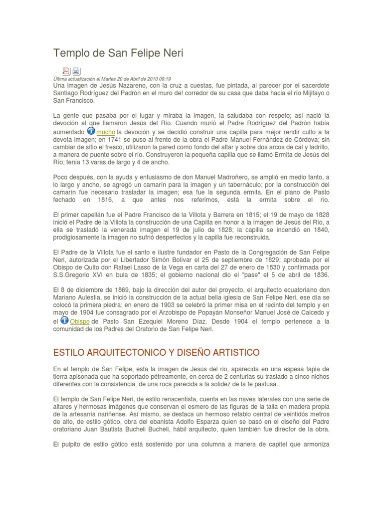 Una imagen de Jess Nazareno, con la cruz a cuestas, fue pintada, al parecer por el sacerdote Santiago Rodrguez del Padrn en el muro de! corredor de su casa que daba hacia el ro Mijitayo o San Francisco. La gente que pasaba por el lugar y miraba la imagen, la saludaba con respeto; as naci la devocin al que llamaron Jess del Ro. Cuando muri el Padre Rodrguez del Padrn haba aumentado mucho la devocin y se decidi construir una capilla para mejor rendir culto a la devota imagen; en 1741 se puso al frente de la obra el Padre Manuel Fernndez de Crdova; sin cambiar de sitio el fresco, utilizaron la pared como fondo del altar y sobre dos arcos de cal y ladrillo, a manera de puente sobre el ro. Construyeron la pequea capilla que se llam Ermita de Jess del Ro; tena 13 varas de largo y 4 de ancho. Poco despus, con la ayuda y entusiasmo de don Manuel Madroero, se ampli en medio tanto, a lo largo y ancho, se agreg un camarn para la imagen y un tabernculo; por la construccin del camarn fue necesario trasladar la imagen; esa fue la segunda ermita. En el plano de Pasto fechado en 1816, a que antes nos referimos, est la ermita sobre el ro. El primer capelln fue el Padre Francisco de la Villota y Barrera en 1815; el 19 de mayo de 1828 inici el Padre de la Villota la construccin de una Capilla en honor a la imagen de Jess del Ro, a ella se traslad la venerada imagen el 19 de julio de 1828; la capilla se incendi en 1840, prodigiosamente la imagen no sufri desperfectos y la capilla fue reconstruida. El Padre de la Villota fue el santo e ilustre fundador en Pasto de la Congregacin de San Felipe Neri, autorizada por el Libertador Simn Bolvar el 25 de septiembre de 1829; aprobada por el Obispo de Quito don Rafael Lasso de la Vega en carta del 27 de enero de 1830 y confirmada por [Link] XVI en bula de 1835; el gobierno nacional dio el "pase" el 5 de abril de 1836. El 8 de diciembre de 1869, bajo la direccin del autor del proyecto, el arquitecto ecuatoriano don Mariano Aulestia, se inici la construccin de la actual bella iglesia de San Felipe Neri, ese da se coloc la primera piedra; en enero de 1903 se celebr la primer misa en el recinto del templo y en mayo de 1904 fue consagrado por el Arzobispo de Popayn Monseor Manuel Jos de Caicedo y el Obispo de Pasto San Ezequiel Moreno Daz. Desde 1904 el templo pertenece a la comunidad de los Padres del Oratorio de San Felipe Neri.
