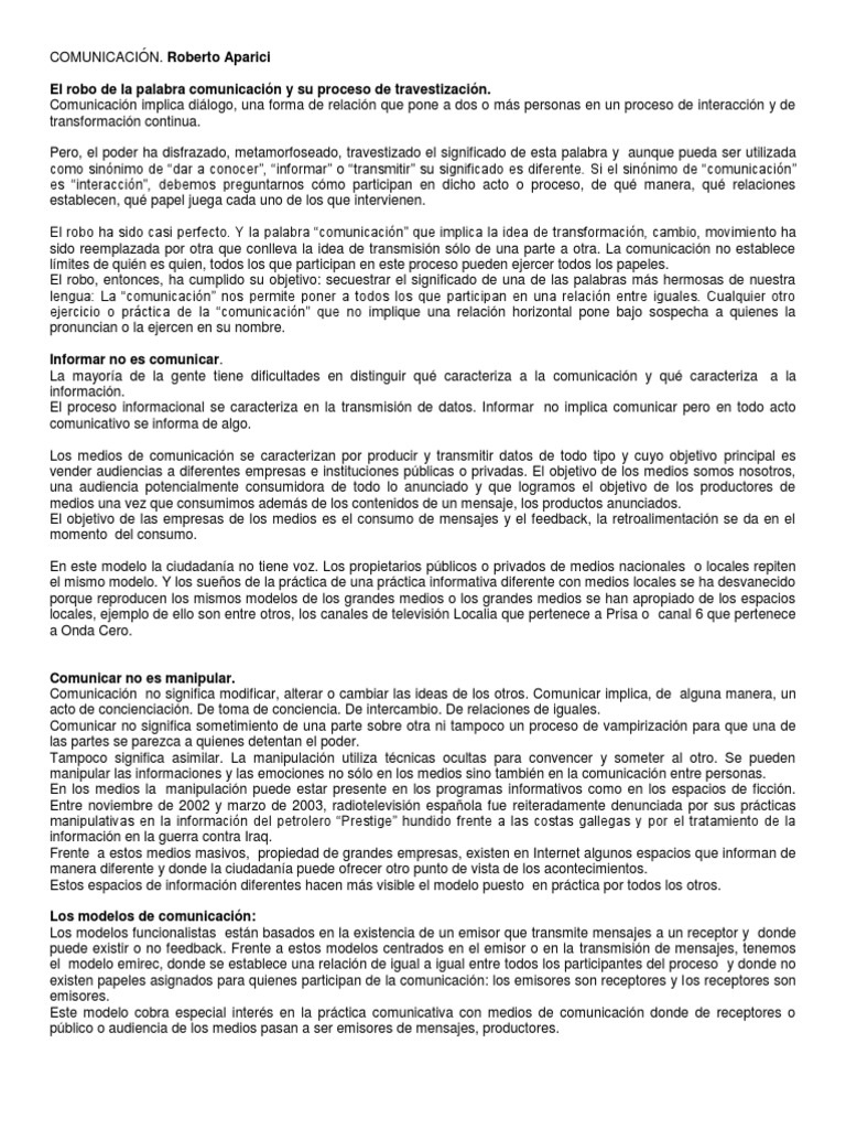 Las relaciones de poder en la comunicacin. En todo proceso de comunicacin dos o ms personas intercambian puntos de vista, emociones o informaciones. Y quienes establecen una relacin autoritaria estn poniendo en prctica su concepcin jerrquica de la interaccin humana. Esta concepcin jerrquica est presente en contextos familiares, sociales, institucionales y se da a nivel local como internacional. Podemos distinguir dos grandes modelos comunicativos: un centrado en la emisin y la ejerce quien detenta el poder o un modelo negociado donde las dos partes construyen y negocian significados de una manera simtrica. El modelo centrado en la emisin es puesto en prctica por los medios de comunicacin y por la mayora de las instituciones educativas. Este modelo jerarquizado donde se distingue quien es quien de manera rgida est tambin presente en las relaciones personales como institucionales o empresVerdanaes. En el segundo modelo no existe esa falsa dicotoma entre emisor y receptor. Aqu todos somos emisores y receptores y todos podemos producir y recibir mensajes en una variedad de signos No existe la comunicacin alternativa. Cuando hablamos de comunicacin alternativa, se est hablando simple y llanamente de la comunicacin: la construccin de mensajes desde dos o ms puntos de vista. Se habla de procesos de construccin del conocimiento desde el punto de vista de la recepcin. Cualquier otro proceso que no implique a dos o ms personas con el mismo nivel de poder, de tratamiento, de rango no es comunicacin. Es un acto autoritario inconsciente o deliberado, pero autoritario al fin. Tecnologa y comunicacin Los estrategas del marketing y de la informtica tambin han usurpado el trmino comunicacin con el fin de llevarla a su terreno. Roban el trmino comunicacin y lo aplican a la conexin entre mquinas no slo con el fin de crear una metfora sino para posicionar a los usuarios en las bondades tecnolgicas. Y asociada a la tecnologa surge una palabra mgica interactividad que los informticos o ingenieros suelen vincular a la relacin de los usuarios con la mquina sin preocuparles si estos usuarios tienen posibilidad de crear o producir mensajes o si, en la mayora de los casos, reproducen el itinerario trazado por los diseadores. Opinin pblica y comunicacin. La comunicacin est vinculada a los actos fundamentales de un ciudadano. Significa participacin, accin. El poder quiere condenarnos a que continuemos siendo slo receptores mudos. Es decir una opinin pblica sin voz. Pero, la opinin pblica ha dejado de ser un elemento de fondo en las relaciones que establece el estado con sus ciudadanos para convertirse en uno de los elementos de decisiones y cambios. Estamos recuperando la palabra, estamos dejando de estar afnicos. La comunicacin es un asunto de todos. Es hora de recuperar lo que nos han expoliado. El texto "Comunicacin educativa de Roberto Aparici corresponde al libro Contra la afona: Breviario urgente para recuperar el lenguaje robado" coordinado por Carlos Prez Vera y Jos Ignacio Fernndez del Castro (Editorial: Las otras caras del planeta, Gijn, 2003, pg. 15-17) Agradecemos a los editores la autorizacin para reproducir este artculo.