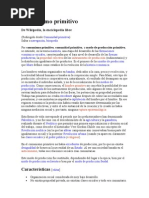 tribus comienzan a unirse forman los pueblos y esos vienen a ser los antecedentes culturales de estados y naciones actuales. Su forma de vida es nmada ya que los hombres no contaban con los conocimientos e instrumentos para trabajar la tierra y obtener alimentos para subsistir. Su alimentacin consista en vegetales frutos y races y sus primero instrumentos fueron rudimentarios o tosco como la piedra y el palo. La comunidad era unida ya que la mayor parte de los medios de produccin y la tierra eran propiedad colectiva los instrumentos de trabajo eran la base de las relaciones de produccin ; en este rgimen el trabajo no creaba mayores excedentes por ser poco productivo es decir nicamente daba lo necesario para subsistir ; las actividades de hecho se apoyaban en la base del cooperativismo y el trabajo se realizaba entre varios hombres y los alimentos se repartan en parte proporcionales entre los integrantes de la comunidad. Con el descubrimiento del fuego comienza a dominar la naturaleza y ampliar su alimentacin ya que empieza a ingerir alimentos cocidos y elaboran nuevos instrumentos de trabajo como son el arco, la flecha, lanza que inician una nueva poca en el desarrollo de la fuerza productiva. Surge la primera divisin del trabajo conocida como la divisin natural la cual consiste en que el hombre se dedica a la caza y a la pesca y la mujer a la recoleccin y elaboracin de los alimentos. Surge la segunda divisin del trabajo representada por la agricultura y la ganadera la cual constituye un paso muy importante en el desarrollo de la fuerza productiva y logar el arraigo del hombre a la tierra trasformado de nmada en sedentario con ellos comienzan a formarse los primeros pueblos y culturas. Surge el trueque ya que con el descubrimientos del fuego y la fundicin de los metales y el invento del tejido se comienzan a fabricar adornos, ropa y armas, las tribus ganaderas y agrcolas intercambia esto por el excedentes de su producto. El desarrollo de la fuerza productiva llega a tal grado que entra en contradiccin con las relaciones de produccin dominantes en la comunidad primitiva, cuya base es el trabajo y la propiedad colectiva de los medios de produccin. Cuando el hombre se da cuenta de que organizando y trabajando duro puede lograr un mayor excedente econmico, empieza a abstenerse de repartir, entre los demos miembros de la comunidad, ocasionando con ello el surgimiento de la propiedad privada sobre los medios de produccin; con ello aparece la hacienda individual y privada que se convierte en la principal unidad econmica. Comunismo primitivo De Wikipedia, la enciclopedia libre Saltar a: navegacin, bsqueda Por comunismo primitivo, comunidad primitiva, o modo de produccin primitivo, se entiende, en la teora marxista, una etapa del desarrollo de las formaciones econmico-sociales, caracterizadas por el bajo nivel de desarrollo de las fuerzas productivas, la propiedad colectiva de los medios de produccin (la tierra y las herramientas rudimentarias) y la distribucin igualitaria de los productos. Es el primero de los modos de produccin que Marx defini como estados de la evolucin de la historia econmica. Caractersticas En el comunismo primitivo los seres humanos estaban organizados en grupos, dedicados a la caza, pesca y recoleccin. La actividad productiva humana se basaba en la cooperacin simple. Para Marx, este tipo de asociacin cooperativa era