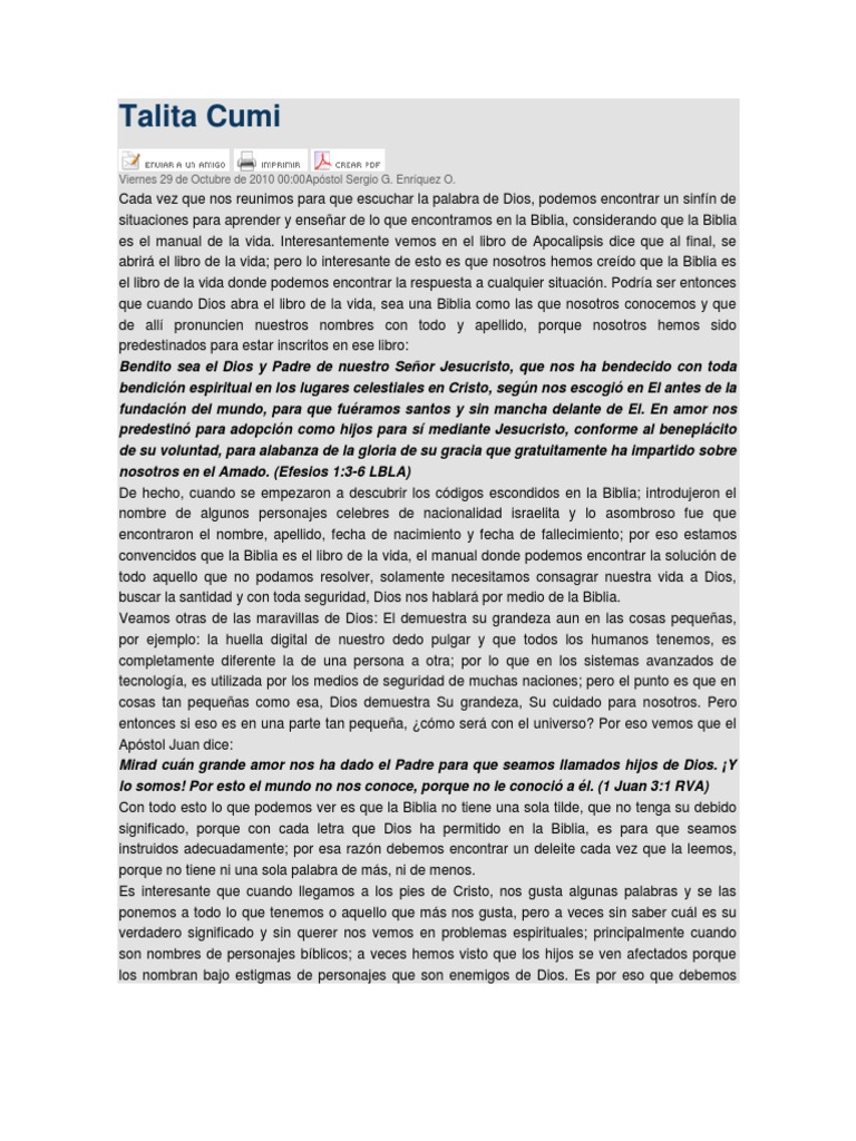 Cada vez que nos reunimos para que escuchar la palabra de Dios, podemos encontrar un sinfn de situaciones para aprender y ensear de lo que encontramos en la Biblia, considerando que la Biblia es el manual de la vida. Interesantemente vemos en el libro de Apocalipsis dice que al final, se abrir el libro de la vida; pero lo interesante de esto es que nosotros hemos credo que la Biblia es el libro de la vida donde podemos encontrar la respuesta a cualquier situacin. Podra ser entonces que cuando Dios abra el libro de la vida, sea una Biblia como las que nosotros conocemos y que de all pronuncien nuestros nombres con todo y apellido, porque nosotros hemos sido predestinados para estar inscritos en ese libro: Bendito sea el Dios y Padre de nuestro Seor Jesucristo, que nos ha bendecido con toda bendicin espiritual en los lugares celestiales en Cristo, segn nos escogi en El antes de la fundacin del mundo, para que furamos santos y sin mancha delante de El. En amor nos predestin para adopcin como hijos para s mediante Jesucristo, conforme al beneplcito de su voluntad, para alabanza de la gloria de su gracia que gratuitamente ha impartido sobre nosotros en el Amado. (Efesios 1:3-6 LBLA) De hecho, cuando se empezaron a descubrir los cdigos escondidos en la Biblia; introdujeron el nombre de algunos personajes celebres de nacionalidad israelita y lo asombroso fue que encontraron el nombre, apellido, fecha de nacimiento y fecha de fallecimiento; por eso estamos convencidos que la Biblia es el libro de la vida, el manual donde podemos encontrar la solucin de todo aquello que no podamos resolver, solamente necesitamos consagrar nuestra vida a Dios, buscar la santidad y con toda seguridad, Dios nos hablar por medio de la Biblia. Veamos otras de las maravillas de Dios: El demuestra su grandeza aun en las cosas pequeas, por ejemplo: la huella digital de nuestro dedo pulgar y que todos los humanos tenemos, es completamente diferente la de una persona a otra; por lo que en los sistemas avanzados de tecnologa, es utilizada por los medios de seguridad de muchas naciones; pero el punto es que en cosas tan pequeas como esa, Dios demuestra Su grandeza, Su cuidado para nosotros. Pero entonces si eso es en una parte tan pequea, cmo ser con el universo? Por eso vemos que el Apstol Juan dice: Mirad cun grande amor nos ha dado el Padre para que seamos llamados hijos de Dios. Y lo somos! Por esto el mundo no nos conoce, porque no le conoci a l. (1 Juan 3:1 RVA) Con todo esto lo que podemos ver es que la Biblia no tiene una sola tilde, que no tenga su debido significado, porque con cada letra que Dios ha permitido en la Biblia, es para que seamos instruidos adecuadamente; por esa razn debemos encontrar un deleite cada vez que la leemos, porque no tiene ni una sola palabra de ms, ni de menos. Es interesante que cuando llegamos a los pies de Cristo, nos gusta algunas palabras y se las ponemos a todo lo que tenemos o aquello que ms nos gusta, pero a veces sin saber cul es su verdadero significado y sin querer nos vemos en problemas espirituales; principalmente cuando son nombres de personajes bblicos; a veces hemos visto que los hijos se ven afectados porque los nombran bajo estigmas de personajes que son enemigos de Dios. Es por eso que debemos
