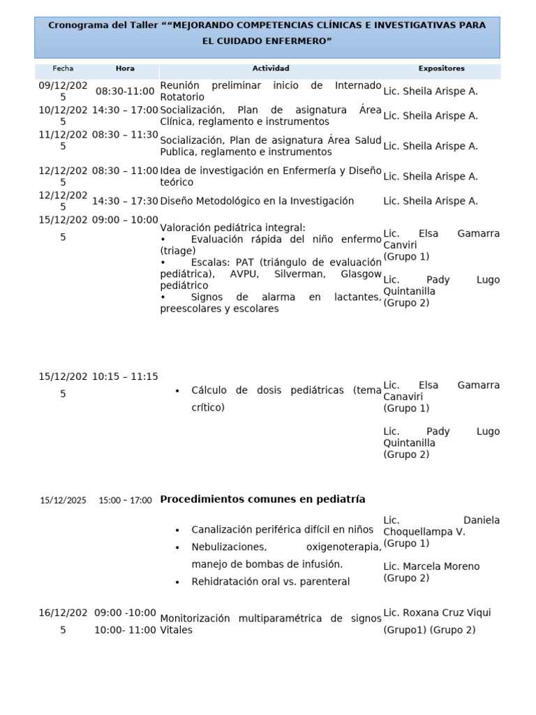 Cronograma del Taller ““MEJORANDO COMPETENCIAS CLÍNICAS E INVESTIGATIVAS PARA