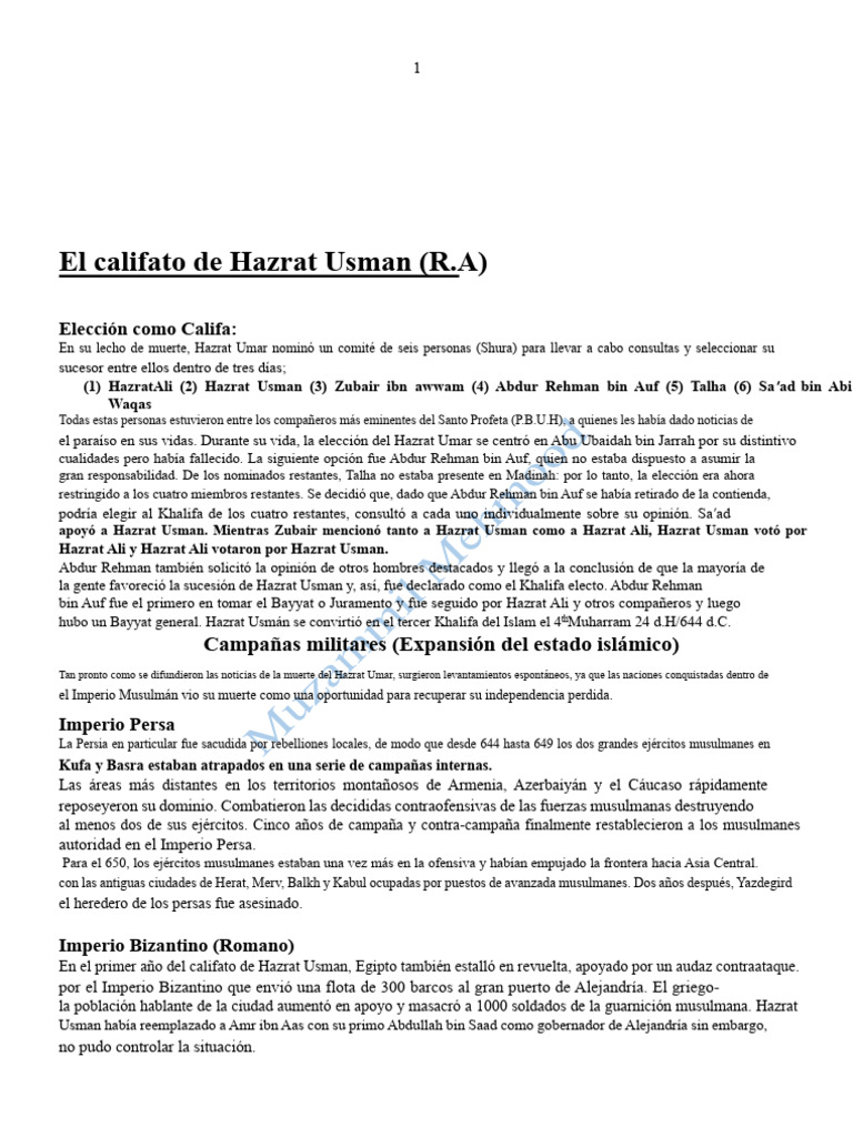 El Hazrat Usman sucedió al califato en 24 AH/644 d.C., elegido por el consejo de seis personas (Shura).