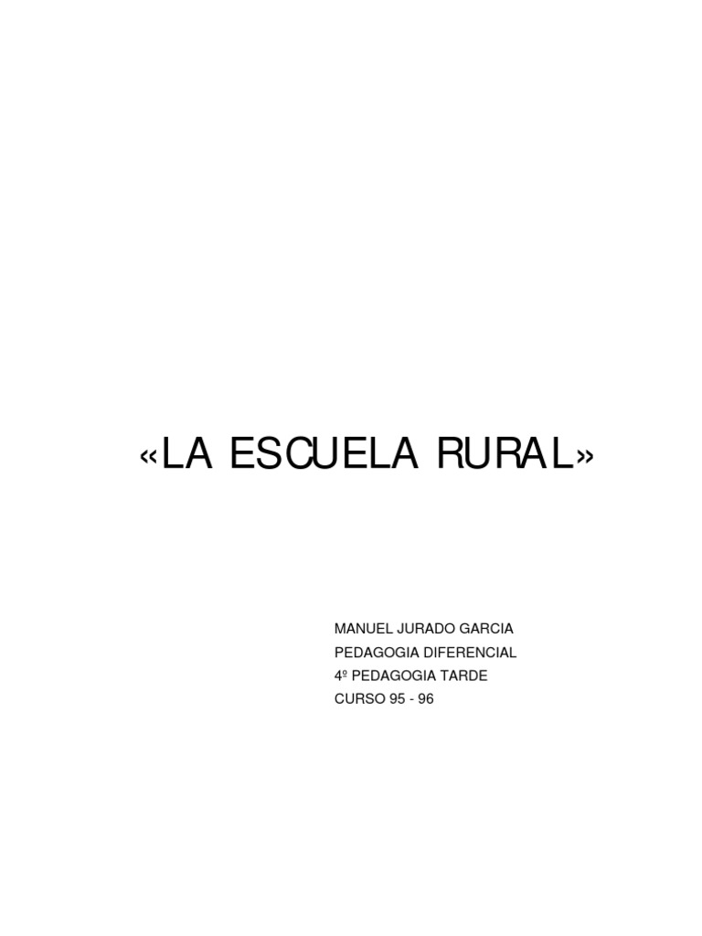* BOIX TOMAS, R. (1995): Estrategias y recursos didcticos en la escuela rural. Barcelona, Univ. Barcelona/Editorial Gra. * CARIDE GOMEZ, (1984): "La escuela rural, recreacin de una identidad en crisis". Cuadernos de Pedagoga, 112. Pgs. 68-75. * CARMENA, G. y REGIDOR, J.R. (1984): La escuela en el medio rural. Madrid, MEC. * CUADERNOS DE PEDAGOGIA N 79 (julio-agosto de 1981): Monogrfico "La escuela rural". Pgs. 4-56. * CUADERNOS DE PEDAGOGIA N 117 (septiembre de 1984): Monogrfico "Educacin compensatoria". Pgs. 3-33. * CUADERNOS DE PEDAGOGIA N 151 (septiembre de 1987): Tema del mes "La educacin en el medio rural". Pgs. 7-49. * CUADERNOS DE PEDAGOGIA N 214 (mayo de 1993): Dossier "Chequeo a la escuela rural". Pgs. 87-104. * FREINET, C. (1981): Por una escuela del pueblo. Barcelona, Laia. * GRANDE, M. (1984): "Cul es el futuro de la escuela rural? Hacia un subsistema especfico de educacin rural". Cuadernos de Pedagoga, 114. Pgs. 49-54. * JIMENEZ FERNANDEZ, CARMEN (1990): Cuestiones sobre las bases diferenciales de la educacin. Madrid, UNED. * JIMENEZ, J. (1983): La escuela unitaria. Barcelona: Laia. * JURADO, M. (1993): "La escuela rural andaluza, hoy". Cuadernos de Pedagoga, 218. Pgs. 79-81. 8
