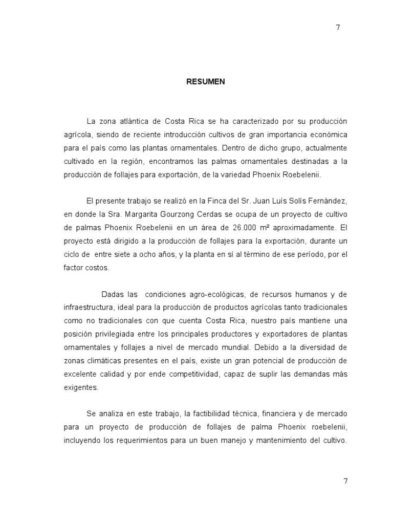 La zona atlntica de Costa Rica se ha caracterizado por su produccin agrcola, siendo de reciente introduccin cultivos de gran importancia econmica para el pas como las plantas ornamentales. Dentro de dicho grupo, actualmente cultivado en la regin, encontramos las palmas ornamentales destinadas a la produccin de follajes para exportacin, de la variedad Phoenix Roebelenii. El presente trabajo se realiz en la Finca del Sr. Juan Lus Sols Fernndez, en donde la Sra. Margarita Gourzong Cerdas se ocupa de un proyecto de cultivo de palmas Phoenix Roebelenii en un rea de 26.000 m aproximadamente. El proyecto est dirigido a la produccin de follajes para la exportacin, durante un ciclo de entre siete a ocho aos, y la planta en s al trmino de ese perodo, por el factor costos. Dadas las condiciones agro-ecolgicas, de recursos humanos y de infraestructura, ideal para la produccin de productos agrcolas tanto tradicionales como no tradicionales con que cuenta Costa Rica, nuestro pas mantiene una posicin privilegiada entre los principales productores y exportadores de plantas ornamentales y follajes a nivel de mercado mundial. Debido a la diversidad de zonas climticas presentes en el pas, existe un gran potencial de produccin de excelente calidad y por ende competitividad, capaz de suplir las demandas ms exigentes. Se analiza en este trabajo, la factibilidad tcnica, financiera y de mercado para un proyecto de produccin de follajes de palma Phoenix roebelenii, incluyendo los requerimientos para un buen manejo y mantenimiento del cultivo.