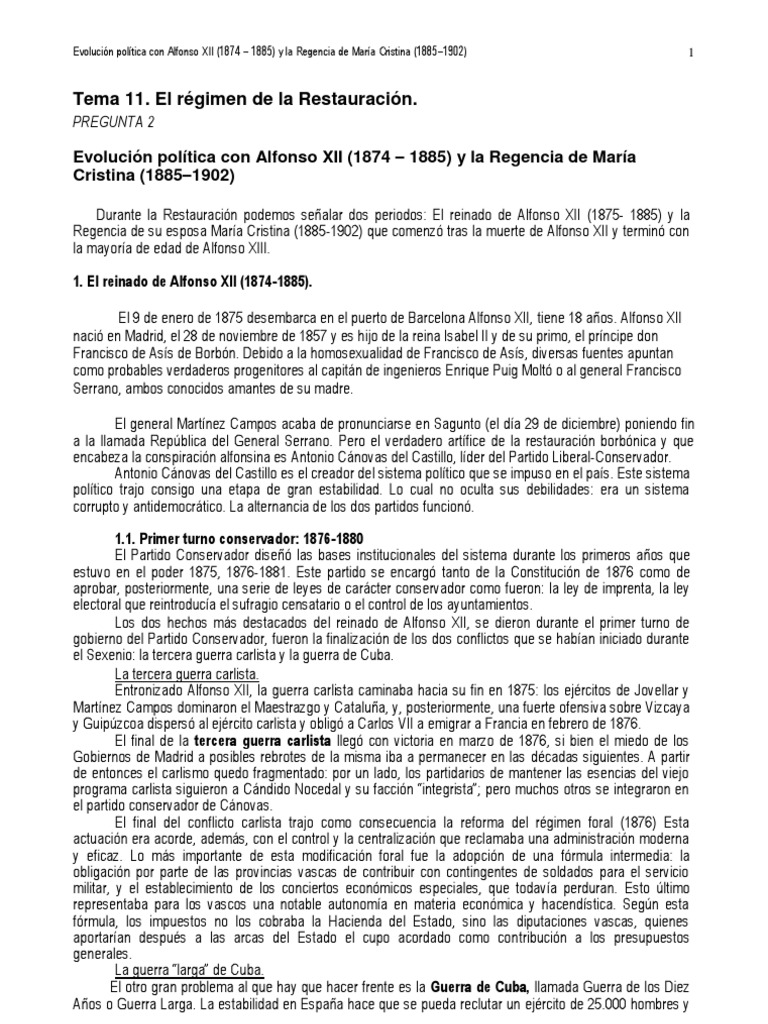 Durante la Restauración podemos señalar dos periodos: El reinado de Alfonso XII (1875- 1885) y la