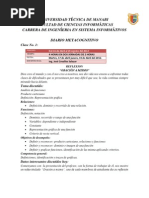 En el siguiente resumen se da a conocer informacin sobre la clase#1 de clculo diferencial en la cual se ha iniciado con una breve explicacin sobre el captulo respectivo. En la primera clase se tomaron en cuenta varios factores acerca de las funciones como: 1. Dominio. 2. Co-dominio. 3. Imagen. RESUMEN Se comenz con la presentacin del profesor, con la forma de trabajar de l, nos mostr un video titulado Oracin a mismo, uno de cada miembros de estudiante dio su reflexin acerca del video, se eligi el asiste, nos present el portafolio del docente del semestre anterior y el portafolio del docente actual, tambin vimos el portafolio estudiantil. En la primera clase del Capitulo #1 se dio la explicacin correspondiente sobre el tema relacionado a Funciones correspondiente al captulo antes mencionado, tomando como principio de la clase el siguiente tema: Relaciones, Funciones - Variables, Producto Cartesiano Las relaciones de funciones se basa en una relacin entre dos conjuntos en el cual el conjunto A ser el Dominio y el conjunto B el Co-dominio. La relacin entre el dominio y el Co-dominio se denomina imagen, recorrido o rango.