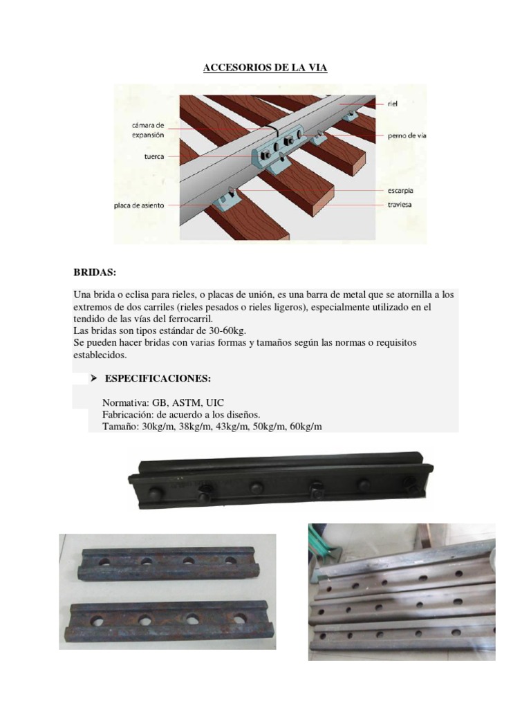 BRIDAS: Una brida o eclisa para rieles, o placas de unin, es una barra de metal que se atornilla a los extremos de dos carriles (rieles pesados o rieles ligeros), especialmente utilizado en el tendido de las vas del ferrocarril. Las bridas son tipos estndar de 30-60kg. Se pueden hacer bridas con varias formas y tamaos segn las normas o requisitos establecidos. ESPECIFICACIONES: Normativa: GB, ASTM, UIC Fabricacin: de acuerdo a los diseos. Tamao: 30kg/m, 38kg/m, 43kg/m, 50kg/m, 60kg/m
