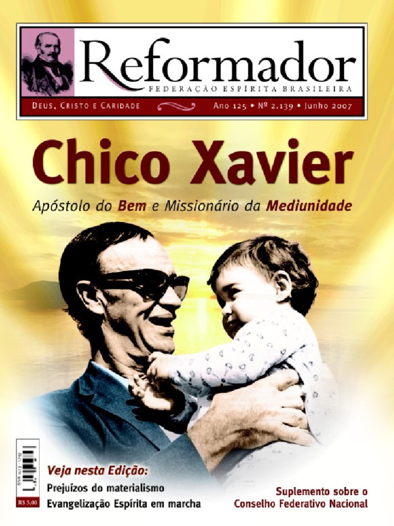 Revista de Espiritismo Cristo Ano 125 / Junho, 2007 / N o 2.139 ISSN 1413-1749 Propriedade e orientao da FEDERAO ESPRITA BRASILEIRA Diretor: NESTOR JOO MASOTTI Diretor-substituto e Editor: ALTIVO FERREIRA Redatores: AFFONSO BORGES GALLEGO SOARES, ANTONIO CESAR PERRI DE CARVALHO, EVANDRO NOLETO BEZERRA E LAURO DE OLIVEIRA SO THIAGO Secretrio: PAULO DE TARSO DOS REIS LYRA Gerente: ILCIO BIANCHI Gerente de Produo: GILBERTO ANDRADE Equipe de Diagramao: SARA AYRES TORRES, AGADYR TORRES E CLAUDIO CARVALHO Equipe de Reviso: MNICA DOS SANTOS E WAGNA CARVALHO REFORMADOR: Registro de publicao o n 121.P.209/73 (DCDP do Departamento de Polcia Federal do Ministrio da Justia), CNPJ 33.644.857/0002-84 I. E. 81.600.503 Direo e Redao: Av. L-2 Norte Q. 603 Conj. F (SGAN) 70830-030 Braslia (DF) Tel.: (61) 2101-6150 FAX: (61) 3322-0523 Departamento Editorial e Grfico: Rua Souza Valente, 17 20941-040 Rio de Janeiro (RJ) Brasil Tel.: (21) 2187-8282 FAX: (21) 2187-8298 E-mail: redacao.reformador@febrasil.org.br Home page: http://www.febnet.org.br E-mail: feb@febrasil.org.br e webmaster@febnet.org.br PARA O BRASIL Assinatura anual R$ 39,00 Nmero avulso R$ 5,00 PARA O EXTERIOR Assinatura anual US$ 35,00 Assinatura de Reformador: Tel.: (21) 2187-8264 2187-8274 E-mail: assinaturas.reformador@febrasil.org.br Projeto grfico da revista: JULIO MOREIRA Capa: AGADYR TORRES