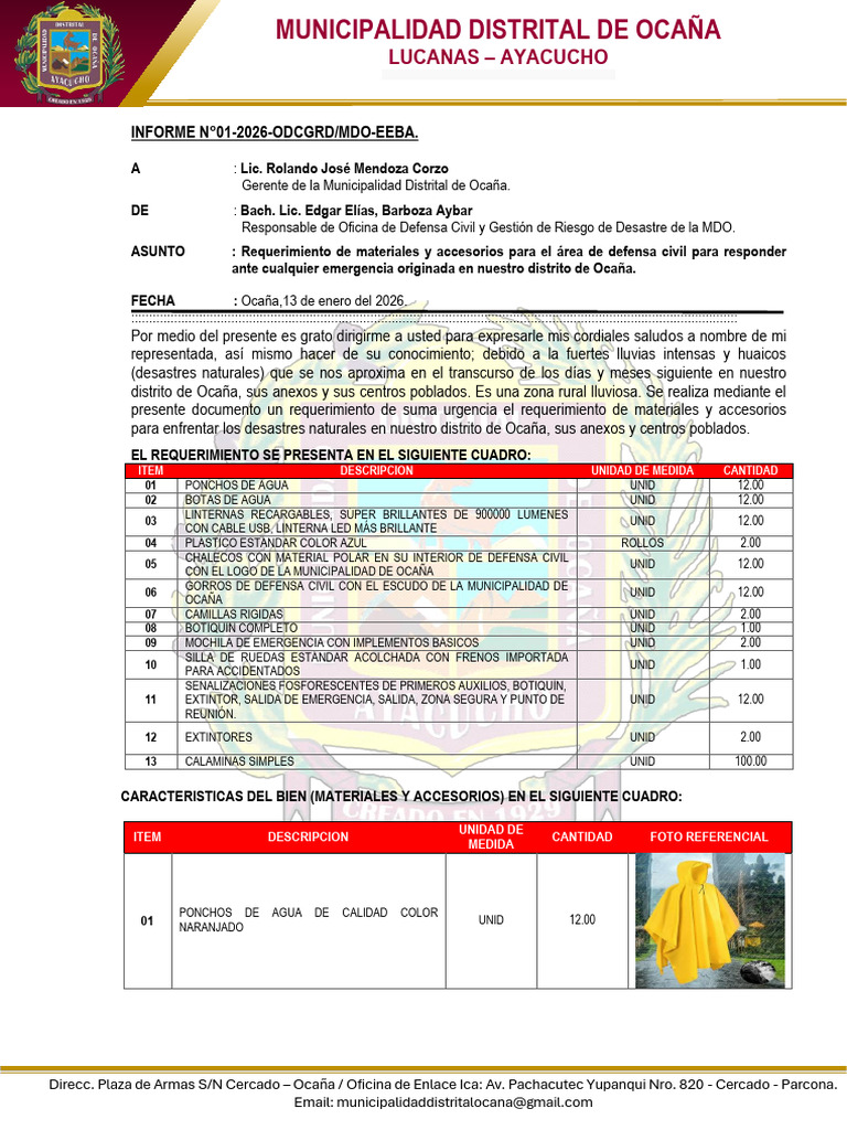 ASUNTO : Requerimiento de materiales y accesorios para el área de defensa civil para responder