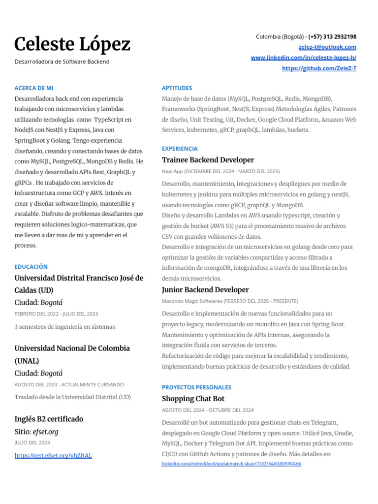 Desarrolladora back end con experiencia Manejo de base de datos (MySQL, PostgreSQL, Redis, MongoDB),