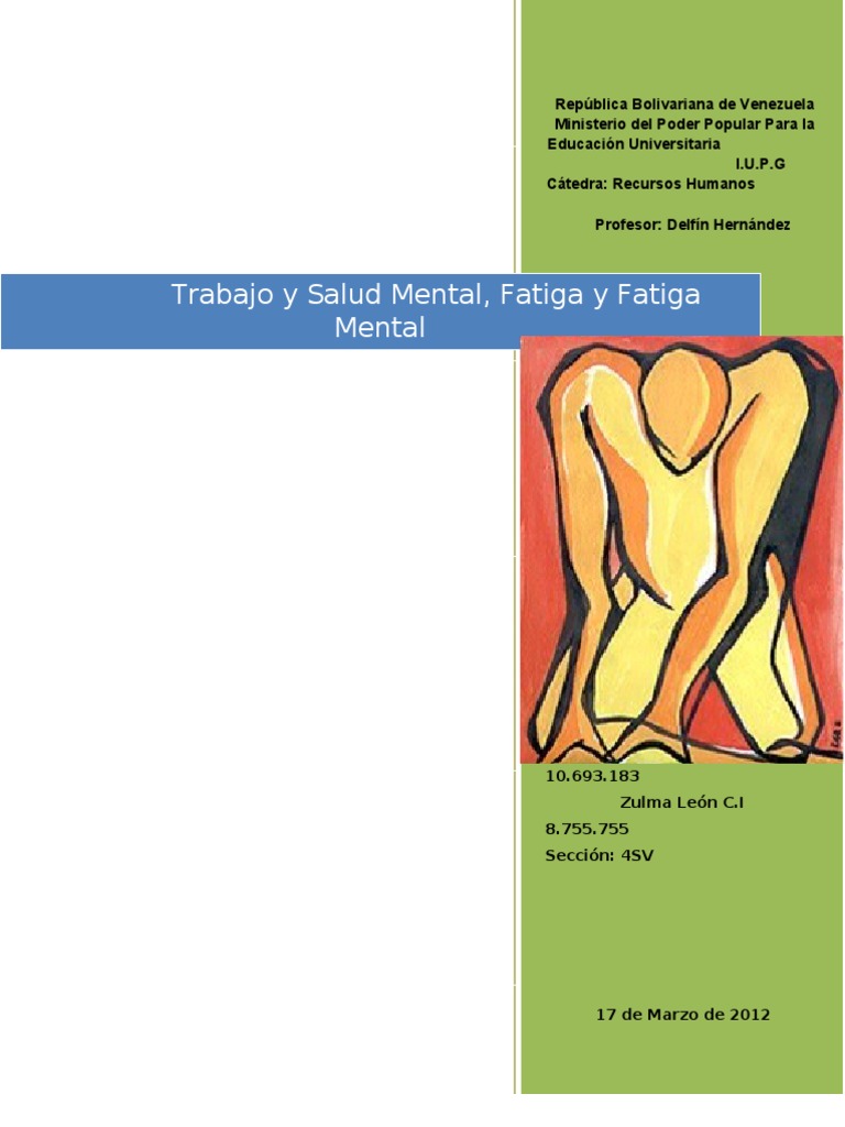INTRODUCCIN El trabajo, puede definirse como la ejecucin de tareas que implican un esfuerzo fsico o mental y que tienen como objetivo la produccin de bienes y servicios para atender las necesidades humanas. En este trabajo se revisan los tipos principales de trastornos de la salud mental que pueden asociarse al trabajo: los trastornos del estado de nimo y del afecto (p. ej., insatisfaccin), el agotamiento. Tambin se ofrecer una perspectiva general sobre la propia salud mental profesional. Se abordar el concepto de salud mental y se presentar un modelo. La fatiga laboral es difcil incluirla como enfermedad, pues no se puede medir, o ver en principio, y porque de forma habitual no se incluye entre los estudios de riesgos laborales. Muchos especialistas desconocen su existencia, y puede tardarse largo tiempo en ser diagnosticada.