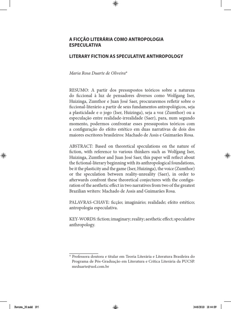 verificável que Cervantes, Sterne, Flaubert ou Kafka nos parecem dignos de crédito. Devido a esse aspecto singular do relato ficcional, podemos definir de um modo global a ficção como uma antropologia especulativa. (JUAN JOSE SAER)