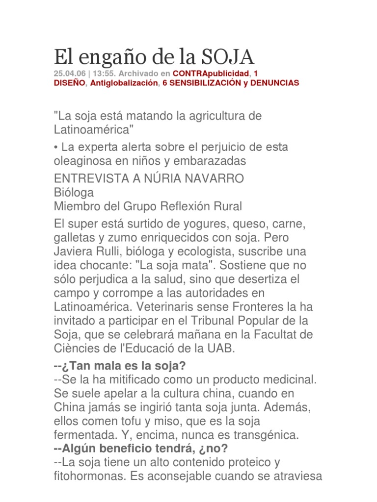 "La soja est matando la agricultura de Latinoamrica" La experta alerta sobre el perjuicio de esta oleaginosa en nios y embarazadas ENTREVISTA A NRIA NAVARRO Biloga Miembro del Grupo Reflexin Rural El super est surtido de yogures, queso, carne, galletas y zumo enriquecidos con soja. Pero Javiera Rulli, biloga y ecologista, suscribe una idea chocante: "La soja mata". Sostiene que no slo perjudica a la salud, sino que desertiza el campo y corrompe a las autoridades en Latinoamrica. Veterinaris sense Fronteres la ha invitado a participar en el Tribunal Popular de la Soja, que se celebrar maana en la Facultat de Cincies de l'Educaci de la UAB. --Tan mala es la soja? --Se la ha mitificado como un producto medicinal. Se suele apelar a la cultura china, cuando en China jams se ingiri tanta soja junta. Adems, ellos comen tofu y miso, que es la soja fermentada. Y, encima, nunca es transgnica. --Algn beneficio tendr, no? --La soja tiene un alto contenido proteico y fitohormonas. Es aconsejable cuando se atraviesa