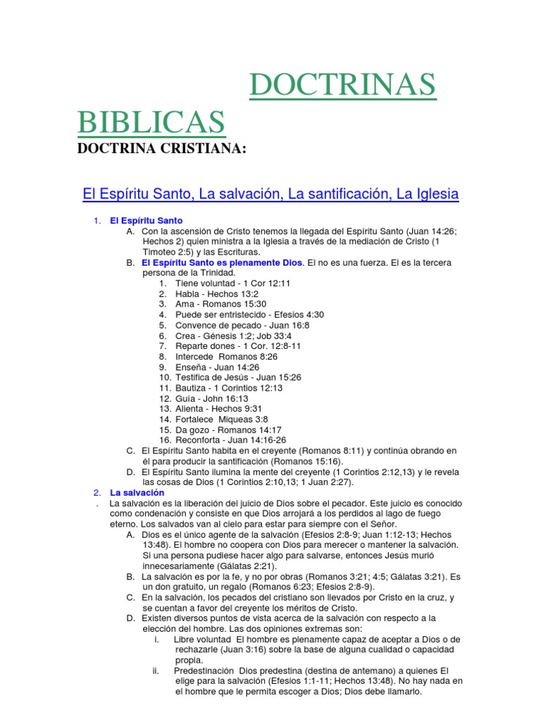 1. El Espritu Santo A. Con la ascensin de Cristo tenemos la llegada del Espritu Santo (Juan 14:26; Hechos 2) quien ministra a la Iglesia a travs de la mediacin de Cristo (1 Timoteo 2:5) y las Escrituras. B. El Espritu Santo es plenamente Dios. El no es una fuerza. El es la tercera persona de la Trinidad. 1. Tiene voluntad - 1 Cor 12:11 2. Habla - Hechos 13:2 3. Ama - Romanos 15:30 4. Puede ser entristecido - Efesios 4:30 5. Convence de pecado - Juan 16:8 6. Crea - Gnesis 1:2; Job 33:4 7. Reparte dones - 1 Cor. 12:8-11 8. Intercede Romanos 8:26 9. Ensea - Juan 14:26 10. Testifica de Jess - Juan 15:26 11. Bautiza - 1 Corintios 12:13 12. Gua - John 16:13 13. Alienta - Hechos 9:31 14. Fortalece Miqueas 3:8 15. Da gozo - Romanos 14:17 16. Reconforta - Juan 14:16-26 C. El Espritu Santo habita en el creyente (Romanos 8:11) y contina obrando en l para producir la santificacin (Romanos 15:16). D. El Espritu Santo ilumina la mente del creyente (1 Corintios 2:12,13) y le revela las cosas de Dios (1 Corintios 2:10,13; 1 Juan 2:27). 2. La salvacin . La salvacin es la liberacin del juicio de Dios sobre el pecador. Este juicio es conocido como condenacin y consiste en que Dios arrojar a los perdidos al lago de fuego eterno. Los salvados van al cielo para estar para siempre con el Seor. A. Dios es el nico agente de la salvacin (Efesios 2:8-9; Juan 1:12-13; Hechos 13:48). El hombre no coopera con Dios para merecer o mantener la salvacin. Si una persona pudiese hacer algo para salvarse, entonces Jess muri innecesariamente (Glatas 2:21). B. La salvacin es por la fe, y no por obras (Romanos 3:21; 4:5; Glatas 3:21). Es un don gratuito, un regalo (Romanos 6:23; Efesios 2:8-9). C. En la salvacin, los pecados del cristiano son llevados por Cristo en la cruz, y se cuentan a favor del creyente los mritos de Cristo. D. Existen diversos puntos de vista acerca de la salvacin con respecto a la eleccin del hombre. Las dos opiniones extremas son: i. Libre voluntad El hombre es plenamente capaz de aceptar a Dios o de rechazarle (Juan 3:16) sobre la base de alguna cualidad o capacidad propia. ii. Predestinacin Dios predestina (destina de antemano) a quienes El elige para la salvacin (Efesios 1:1-11; Hechos 13:48). No hay nada en el hombre que le permita escoger a Dios; Dios debe llamarlo.