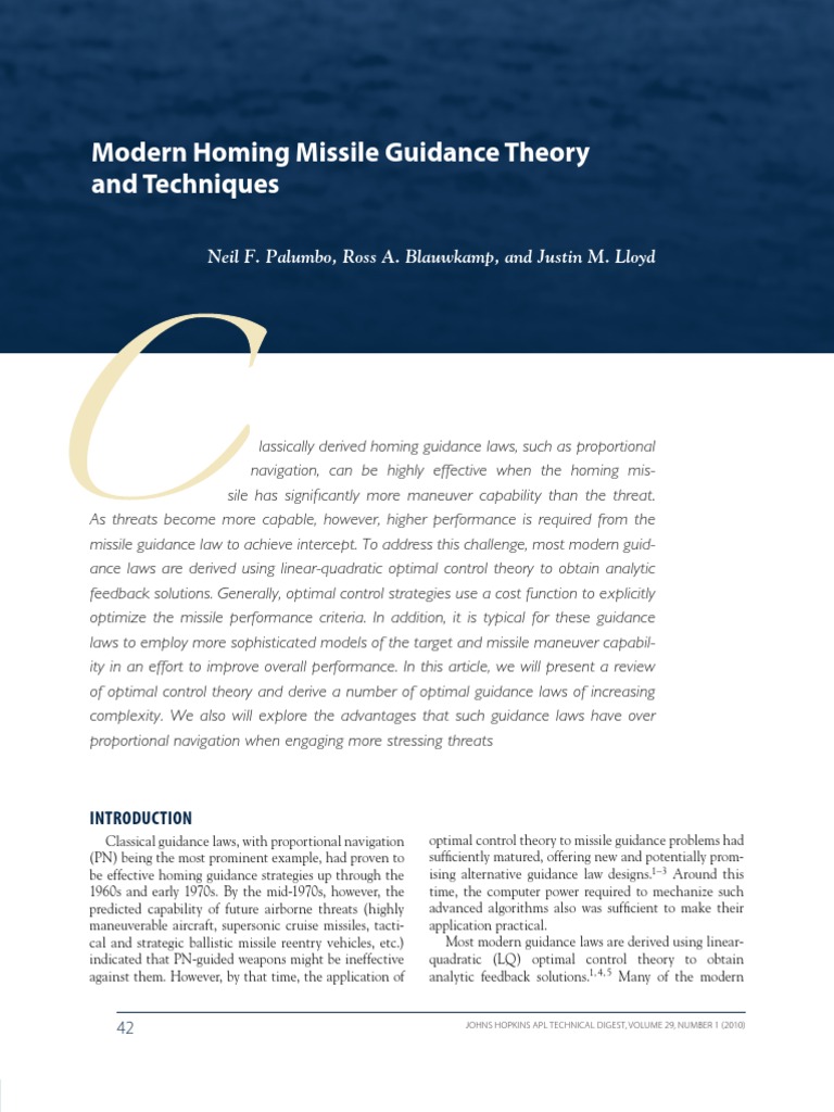 P. B., TOMAHAWK 1090 Autopilot Improvements: PitchYaw-Roll Autopilot Design, Technical Memorandum F1E(90)U-1-305, JHU/APL, Laurel, MD (1 Aug 1990). 6 Basar, T., and Bernhard, P., H-Infinity Optimal Control and Related Minimax Design Problems, Birkhuser, Boston (1995). 7Ben-Asher, J. Z., and Yaesh, I., Advances in Missile Guidance Theory, American Institute of Aeronautics and Astronautics, Reston, VA (1998). 8Grewal, M. S., and Andrews, A. P., Kalman Filtering Theory and Practice, Prentice Hall, Englewood Cliffs, NJ (1993). 9Pearson, J. D., Approximation Methods in Optimal Control, J. Electron. Control 13, 453469 (1962). 10Vaughan, D. R., A Negative Exponential Solution for the Matrix Riccati Equation, IEEE Trans. Autom. Control 14(2), 7275 (Feb 1969). 11Vaughan, D. R., A Nonrecursive Algebraic Solution for the Discrete Riccati Equation, IEEE Trans. Autom. Control 15(10), 597599 (Oct 1970). 12Pue, A. J., Proportional Navigation and an Optimal-Aim Guidance Technique, Technical Memorandum F1C (2)-80-U-024, JHU/APL, Laurel, MD (7 May 1980). 13Zames, G., Feedback and Optimal Sensitivity: Model Reference Transformations, Multiplicative Seminorms, and Approximate Inverses, IEEE Trans. Autom. Control 26, 301320 (1981). 14Shneydor, N. A., Missile Guidance and Pursuit: Kinematics, Dynamics and Control, Horwood Publishing, Chichester, England (1998).