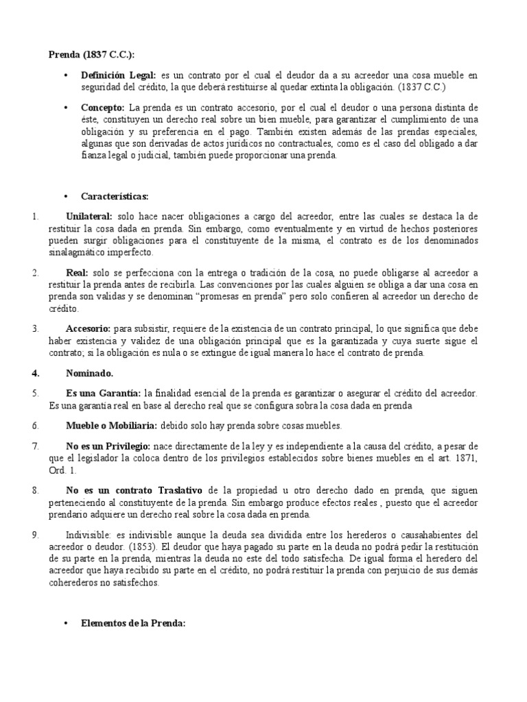 Unilateral: solo hace nacer obligaciones a cargo del acreedor, entre las cuales se destaca la de restituir la cosa dada en prenda. Sin embargo, como eventualmente y en virtud de hechos posteriores pueden surgir obligaciones para el constituyente de la misma, el contrato es de los denominados sinalagmtico imperfecto. Real: solo se perfecciona con la entrega o tradicin de la cosa, no puede obligarse al acreedor a restituir la prenda antes de recibirla. Las convenciones por las cuales alguien se obliga a dar una cosa en prenda son validas y se denominan promesas en prenda pero solo confieren al acreedor un derecho de crdito. Accesorio: para subsistir, requiere de la existencia de un contrato principal, lo que significa que debe haber existencia y validez de una obligacin principal que es la garantizada y cuya suerte sigue el contrato; si la obligacin es nula o se extingue de igual manera lo hace el contrato de prenda. Nominado. Es una Garanta: la finalidad esencial de la prenda es garantizar o asegurar el crdito del acreedor. Es una garanta real en base al derecho real que se configura sobra la cosa dada en prenda Mueble o Mobiliaria: debido solo hay prenda sobre cosas muebles. No es un Privilegio: nace directamente de la ley y es independiente a la causa del crdito, a pesar de que el legislador la coloca dentro de los privilegios establecidos sobre bienes muebles en el art. 1871, Ord. 1. No es un contrato Traslativo de la propiedad u otro derecho dado en prenda, que siguen perteneciendo al constituyente de la prenda. Sin embargo produce efectos reales , puesto que el acreedor prendario adquiere un derecho real sobre la cosa dada en prenda. Indivisible: es indivisible aunque la deuda sea dividida entre los herederos o causahabientes del acreedor o deudor. (1853). El deudor que haya pagado su parte en la deuda no podr pedir la restitucin de su parte en la prenda, mientras la deuda no este del todo satisfecha. De igual forma el heredero del acreedor que haya recibido su parte en el crdito, no podr restituir la prenda con perjuicio de sus dems coherederos no satisfechos.