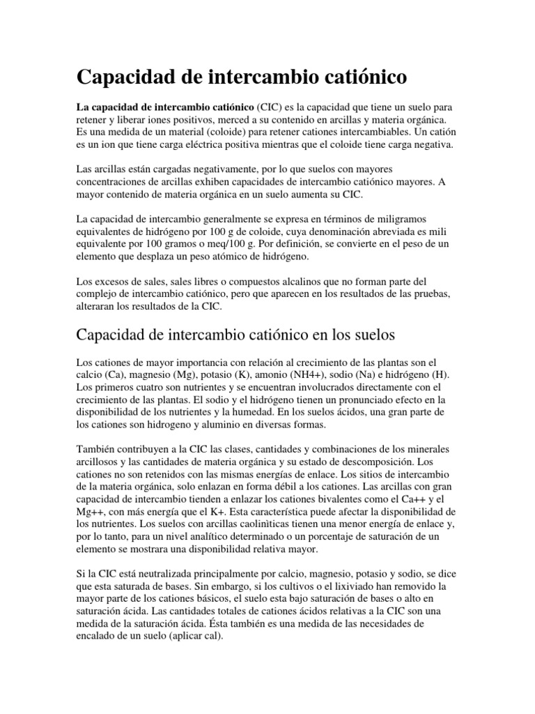 La capacidad de intercambio catinico (CIC) es la capacidad que tiene un suelo para retener y liberar iones positivos, merced a su contenido en arcillas y materia orgnica. Es una medida de un material (coloide) para retener cationes intercambiables. Un catin es un ion que tiene carga elctrica positiva mientras que el coloide tiene carga negativa. Las arcillas estn cargadas negativamente, por lo que suelos con mayores concentraciones de arcillas exhiben capacidades de intercambio catinico mayores. A mayor contenido de materia orgnica en un suelo aumenta su CIC. La capacidad de intercambio generalmente se expresa en trminos de miligramos equivalentes de hidrgeno por 100 g de coloide, cuya denominacin abreviada es mili equivalente por 100 gramos o meq/100 g. Por definicin, se convierte en el peso de un elemento que desplaza un peso atmico de hidrgeno. Los excesos de sales, sales libres o compuestos alcalinos que no forman parte del complejo de intercambio catinico, pero que aparecen en los resultados de las pruebas, alteraran los resultados de la CIC.