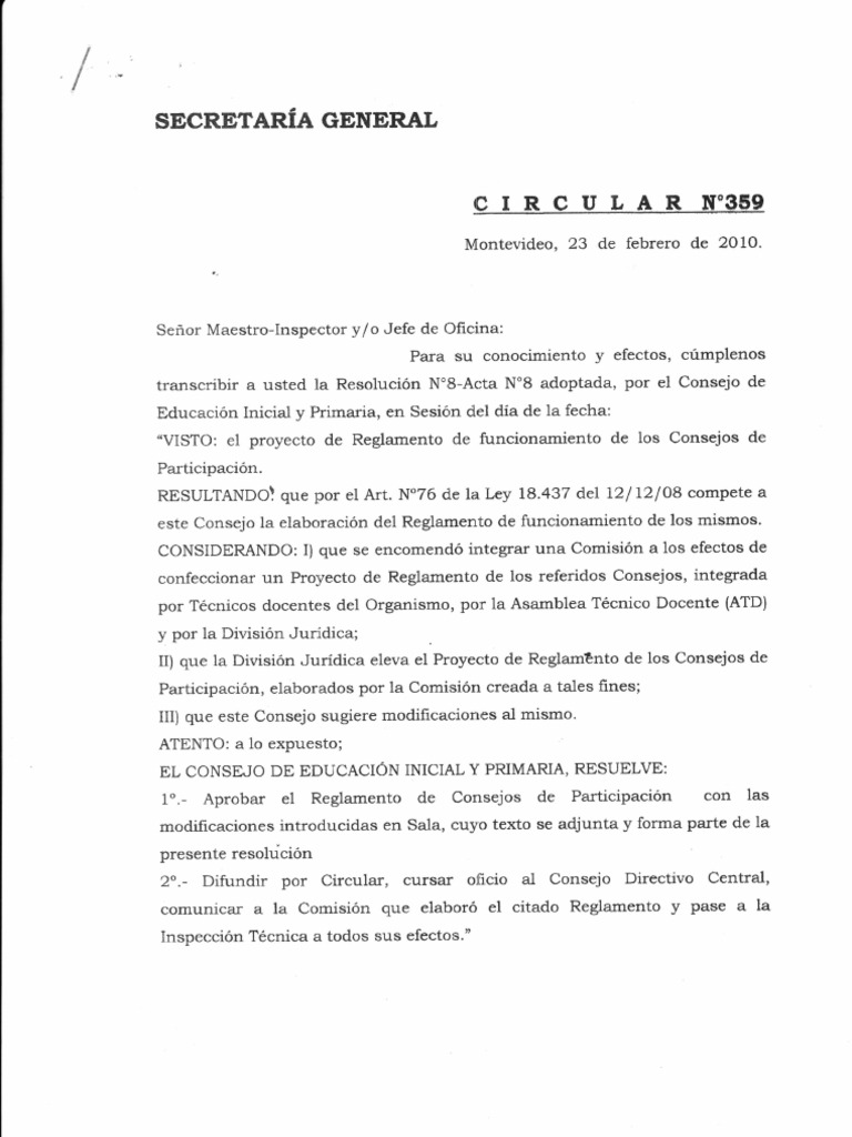 Artculo 1'- De acuerdo a 1o dispuesto en el Artculo 76 de la Ley N"18.437 del 12 de diciembre de 2008, en todo centro educativo pblico de Educacin Inicial y Primaria, funcionar un Consejo de Participacin cuya eleccin, integracin, funcionamiento se regirLn por las disposiciones que a