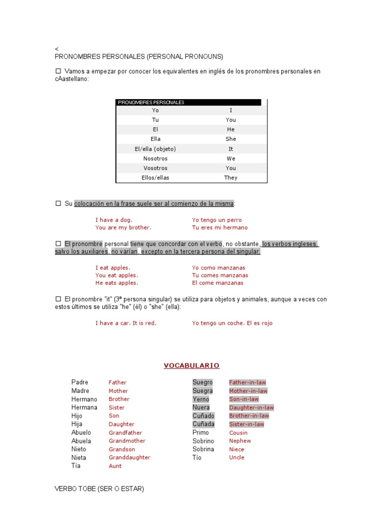 El verbo "to be" en ingls es equivalente a los verbos "ser" y "estar" en castellano. Su declinacin en el presente del indicativo (simple present) es la siguiente: