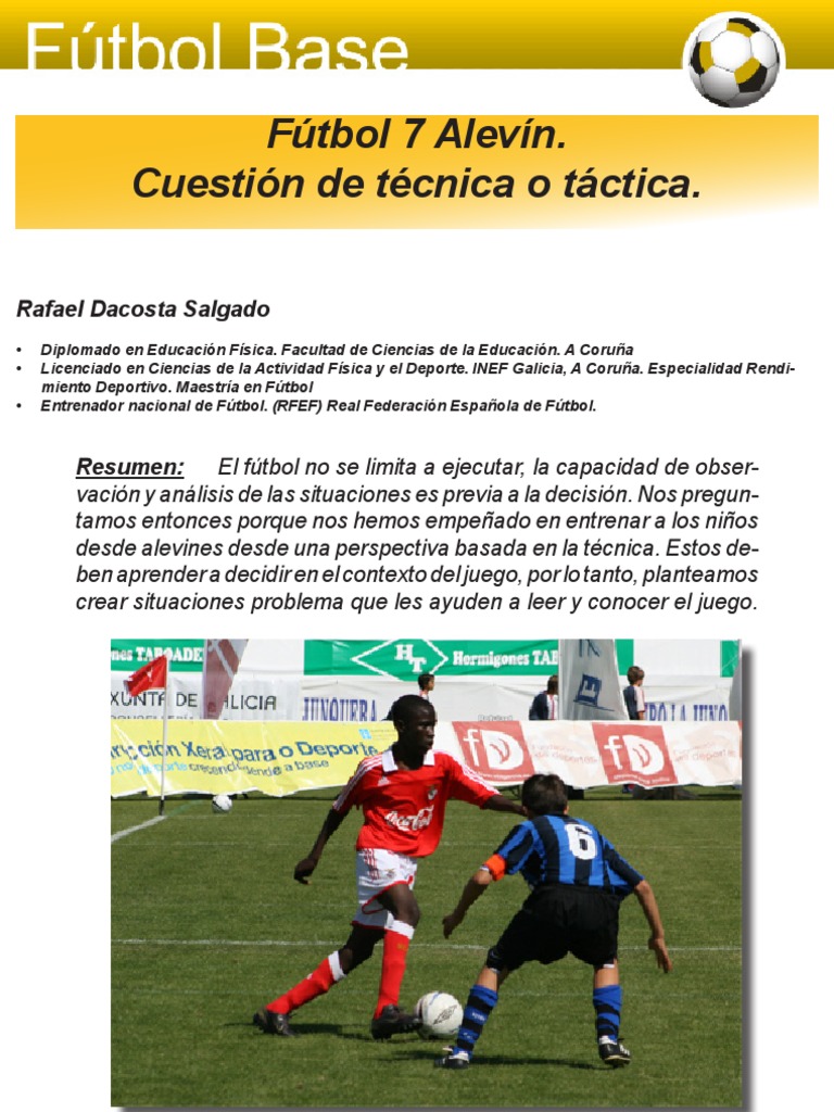 Resumen: El ftbol no se limita a ejecutar, la capacidad de observacin y anlisis de las situaciones es previa a la decisin. Nos preguntamos entonces porque nos hemos empeado en entrenar a los nios desde alevines desde una perspectiva basada en la tcnica. Estos deben aprender a decidir en el contexto del juego, por lo tanto, planteamos crear situaciones problema que les ayuden a leer y conocer el juego.