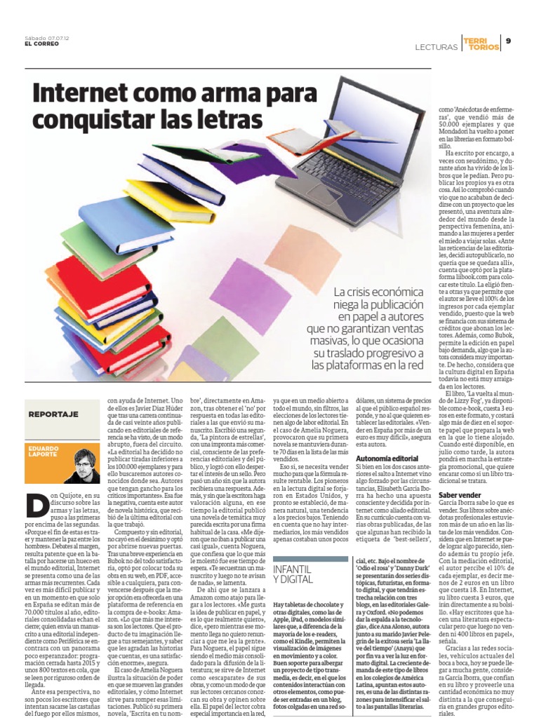 on Quijote, en su discurso sobre las armas y las letras, puso a las primeras por encima de las segundas. Porque el fin de estas es traer y mantener la paz entre los hombres. Debates al margen, resulta patente que en la batalla por hacerse un hueco en el mundo editorial, Internet se presenta como una de las armas ms recurrentes. Cada vez es ms difcil publicar y en un momento en que solo en Espaa se editan ms de 70.000 ttulos al ao, editoriales consolidadas echan el cierre; quien enva un manuscrito a una editorial independiente como Perifrica se encontrara con un panorama poco esperanzador: programacin cerrada hasta 2015 y unos 800 textos en cola, que se leen por riguroso orden de llegada. Ante esa perspectiva, no son pocos los escritores que intentan sacarse las castaas del fuego por ellos mismos,