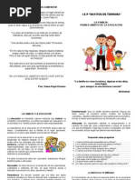 CONTENIDO 1. Conoce el origen de la palabra educacin? 2. Sabe cul es la diferencia entre educar e instruir? 3. Ha ledo algn libro sobre temas educativos? 4. Est preparado para comentar con sus hijos temas sexuales? 5. Sabe cmo actuar si su hijo ingresa al mundo de la droga? 6. Puede escribir una pgina con este tema: Los hijos sern lo que son los padres? 7. Puede ayudar a sus hijos en la preparacin de las tareas? 8. Puede guardar el equilibrio en la educacin de sus hijos, enrgico sin ser rgido, bueno sin ser dbil, equitativo sin preferencias, franco y abierto sin que lo irrespeten? 9. Considera que el ambiente del hogar influye en el nio durante los primeros aos de vida? 10. Si se entera que su hija soltera sostiene relaciones sexuales, sabra manejar la situacin?