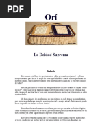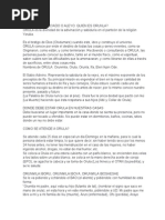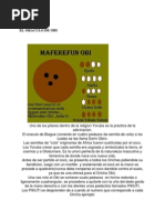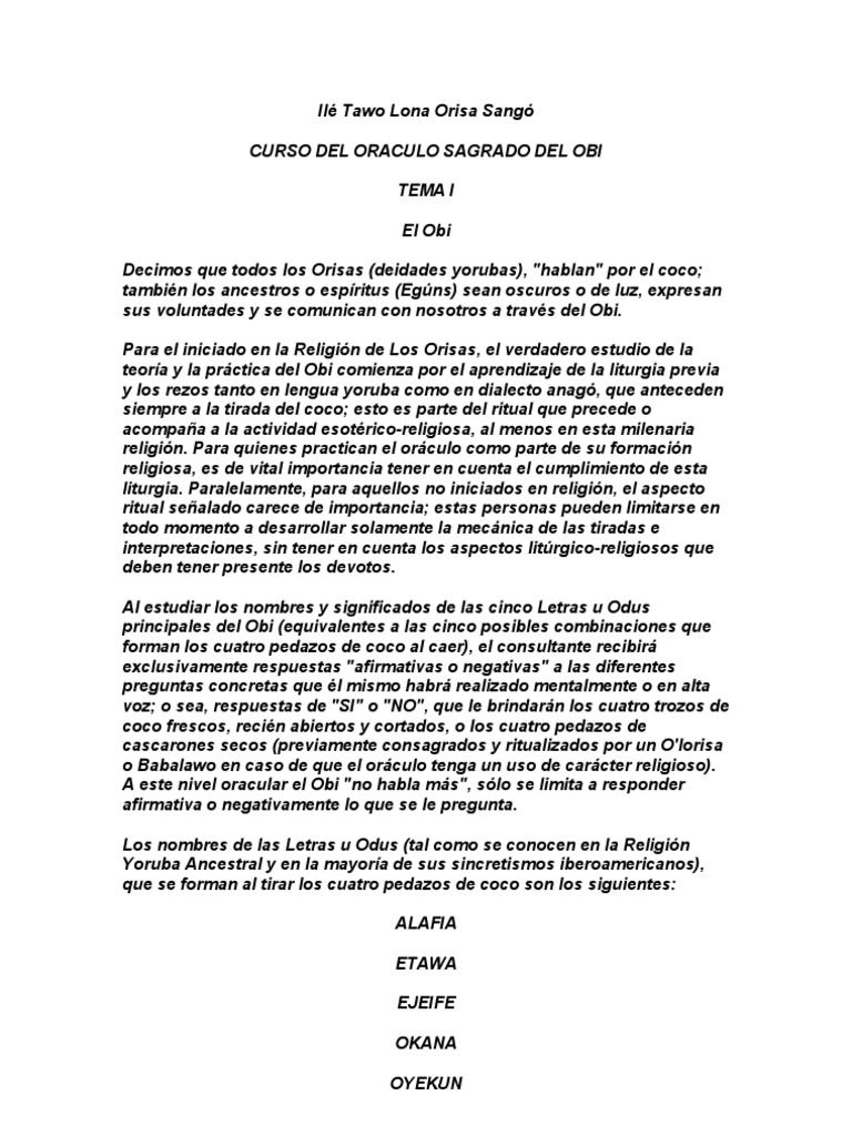 ahora voy a comenzar. Y lbrame de la muerte, la enfermedad, la tragedia, la maledicencia y la envidia de quienes no me quieren bien). REZO A OSHUN (Osn) "Oshn ig ly mo, ig ly mo, Iko bo si Iy mi gasi Iy mo. Yalodd oguid abal ab de bu om male ad. Elegeni kikirisoked to she ni kuel Yey mor". (Oshn, mi madre sagrada, duea del ro y de las aguas dulces que conforman tu cuerpo. Reina del amor, la fertilidad y las riquezas. Oshn Yalodde, bendceme en este acto con todo tu poder, investida bajo tu otro poderoso camino de Yey Mor, con el cual arrasas con las dificultades y los obstculos de la vida de tus hijos). REZO A OYA "Oya Yanza Orire om lelu, Oy Koy, kofiedeno, Oy ay lo da, ay mem omi ent, om cu cu ay Orunmila mo talembe mi l. Jkua jei, Yansa, Iyansa, oro Ik jer obini dod". (Reina del mundo silencioso de la muerte. Oy, poderosa diosa de la centella y de la guerra dame tu bendicin, otrgame fuerzas para vencer las dificultades de la vida y las pruebas que ahora me vendrn. Dame tu ash y tu bendicin). REZO A LOS IBEYIS (Ibejis) "Ibeji oro om no ku, o Orunla apetev aya, ain aib igu Ide, Kaind". (Ibejis, Orisas poderosos, hijos de Chang y Oshn, dioses de la guerra y el amor. Vencedores del mal. Les imploro vuestra proteccin y bendiciones). CURSO DEL ORACULO SAGRADO DEL OBI TEMA IV El Obi REZO A INLE "Inle Malekueo ara kabo arag, Inle Araga niy". (Inle, mdico divino de los Orisas. Dame tu ash y tu bendicin para llevar a cabo esta labor). 09. Ahora deber mojubar a los Babalawos y O'lorisas muertos (aunque Ud. no haya conocido a ninguno, este acto es simplemente para presentar sus