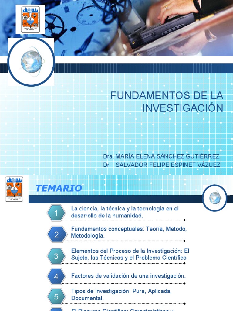 La ciencia, la tcnica y la tecnologa en el desarrollo de la humanidad. Fundamentos conceptuales: Teora, Mtodo, Metodologa. Elementos del Proceso de la Investigacin: El Sujeto, las Tcnicas y el Problema Cientfico Factores de validacin de una investigacin. Tipos de Investigacin: Pura, Aplicada, Documental. El Discurso Cientfico: Caractersticas y Tipologas. Desarrollo de una Investigacin Documental.