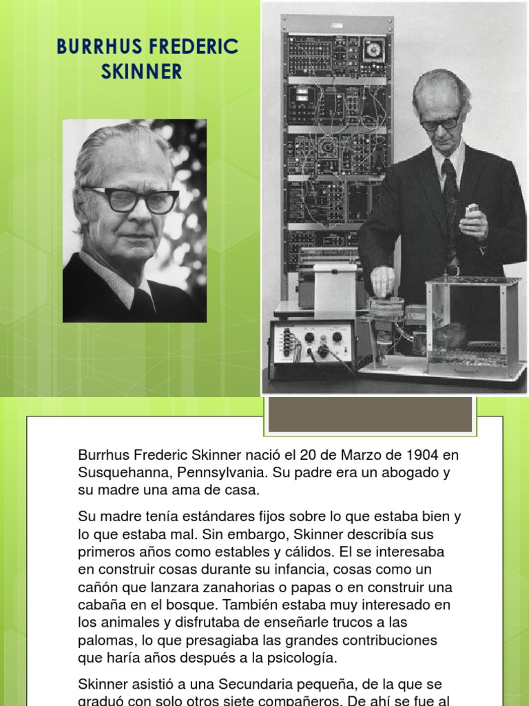 Burrhus Frederic Skinner naci el 20 de Marzo de 1904 en Susquehanna, Pennsylvania. Su padre era un abogado y su madre una ama de casa. Su madre tena estndares fijos sobre lo que estaba bien y lo que estaba mal. Sin embargo, Skinner describa sus primeros aos como estables y clidos. El se interesaba en construir cosas durante su infancia, cosas como un can que lanzara zanahorias o papas o en construir una cabaa en el bosque. Tambin estaba muy interesado en los animales y disfrutaba de ensearle trucos a las palomas, lo que presagiaba las grandes contribuciones que hara aos despus a la psicologa. Skinner asisti a una Secundaria pequea, de la que se gradu con solo otros siete compaeros. De ah se fue al Hamilton College de Nueva York, donde entr a la fraternidad Phi Beta Kappa, aunque nunca se sinti que encajara bien en ella.