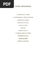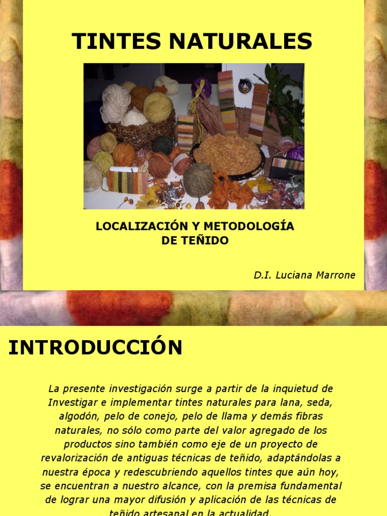 La presente investigacin surge a partir de la inquietud de Investigar e implementar tintes naturales para lana, seda, algodn, pelo de conejo, pelo de llama y dems fibras naturales, no slo como parte del valor agregado de los productos sino tambin como eje de un proyecto de revalorizacin de antiguas tcnicas de teido, adaptndolas a nuestra poca y redescubriendo aquellos tintes que an hoy, se encuentran a nuestro alcance, con la premisa fundamental de lograr una mayor difusin y aplicacin de las tcnicas de teido artesanal en la actualidad.