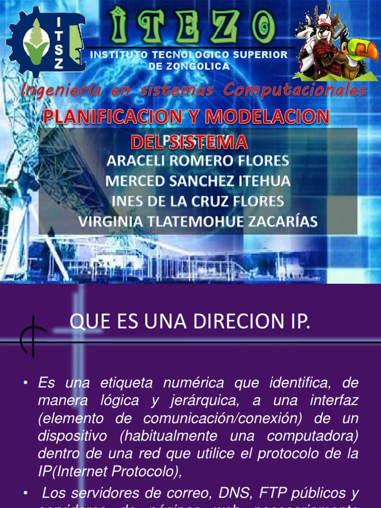 Es una etiqueta numrica que identifica, de manera lgica y jerrquica, a una interfaz (elemento de comunicacin/conexin) de un dispositivo (habitualmente una computadora) dentro de una red que utilice el protocolo de la IP(Internet Protocolo), Los servidores de correo, DNS, FTP pblicos y servidores de pginas web necesariamente deben contar con una direccin IP fija o esttica, ya que de esta forma se permite su localizacin en la red.