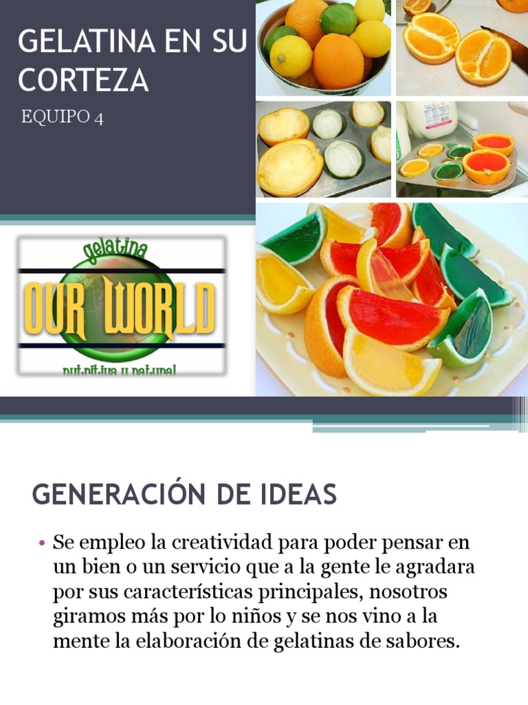 Se hizo un estudio y se platico que ya existen infinidad de productos similares al que se tiene pensado realizar, existen tanto marcas como diseos, pero no existe ninguna como la idea que tenemos, todos los embases de estas gelatinas son de materiales no biodegradables y contribuyen a la contaminacin del planeta tierra, nuestra idea principal o innovadora es que el empaque de estas sern en cascaras de frutos, y dependiendo el fruto ser el sabor de la gelatina, un ejemplo: de las cascaras de naranjas se llena de la mezcla liquida y al ponerse en refrigeracin solidificara y quedara en ese molde o recipiente, y estas al desecharse, sirven de materia orgnica o composta para nuestra tierra.